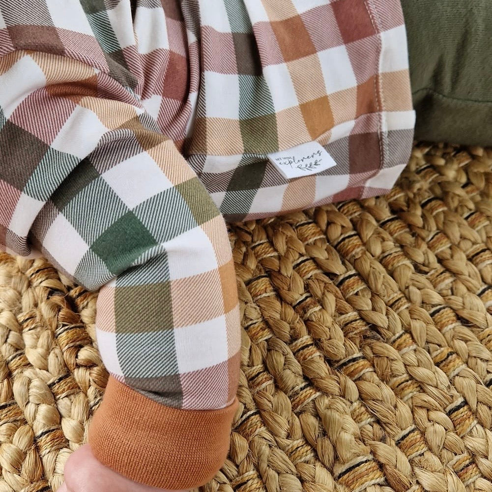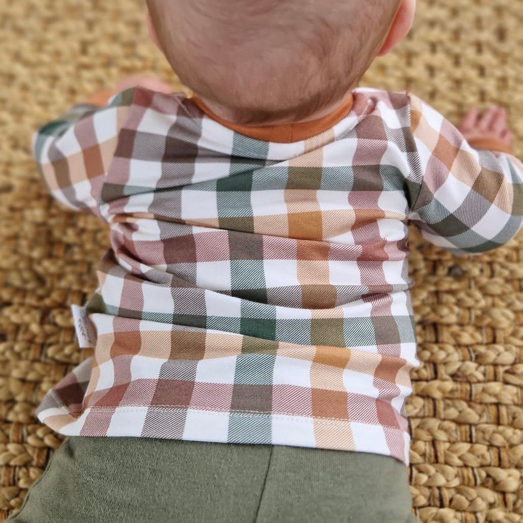 Made from soft, breathable organic cotton, this baby plaid top features a classic check design in warm, earthy tones of army green, burnt orange, chocolate brown, and white. A must-have for any autumn baby outfit, it combines timeless seasonal style with all-day comfort.