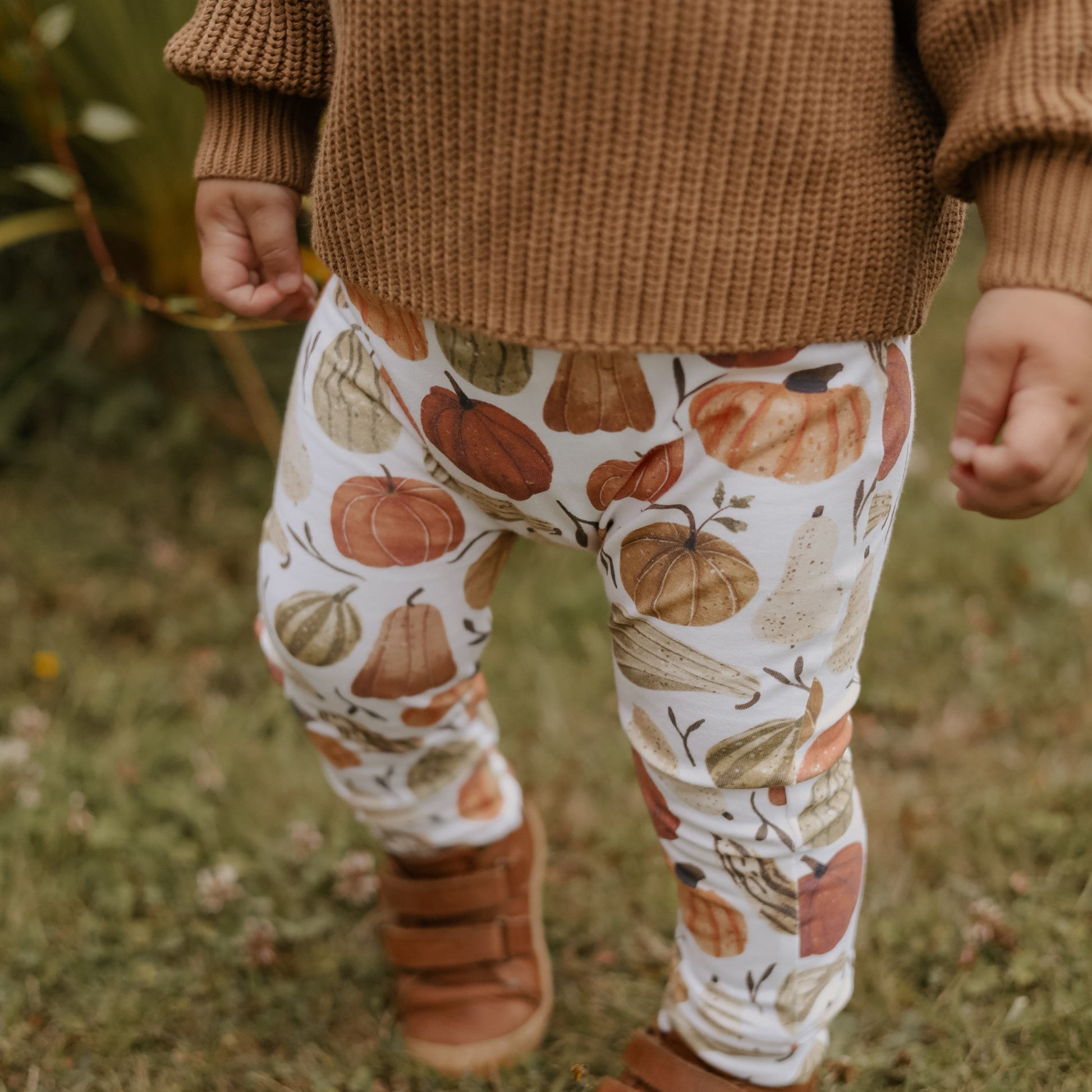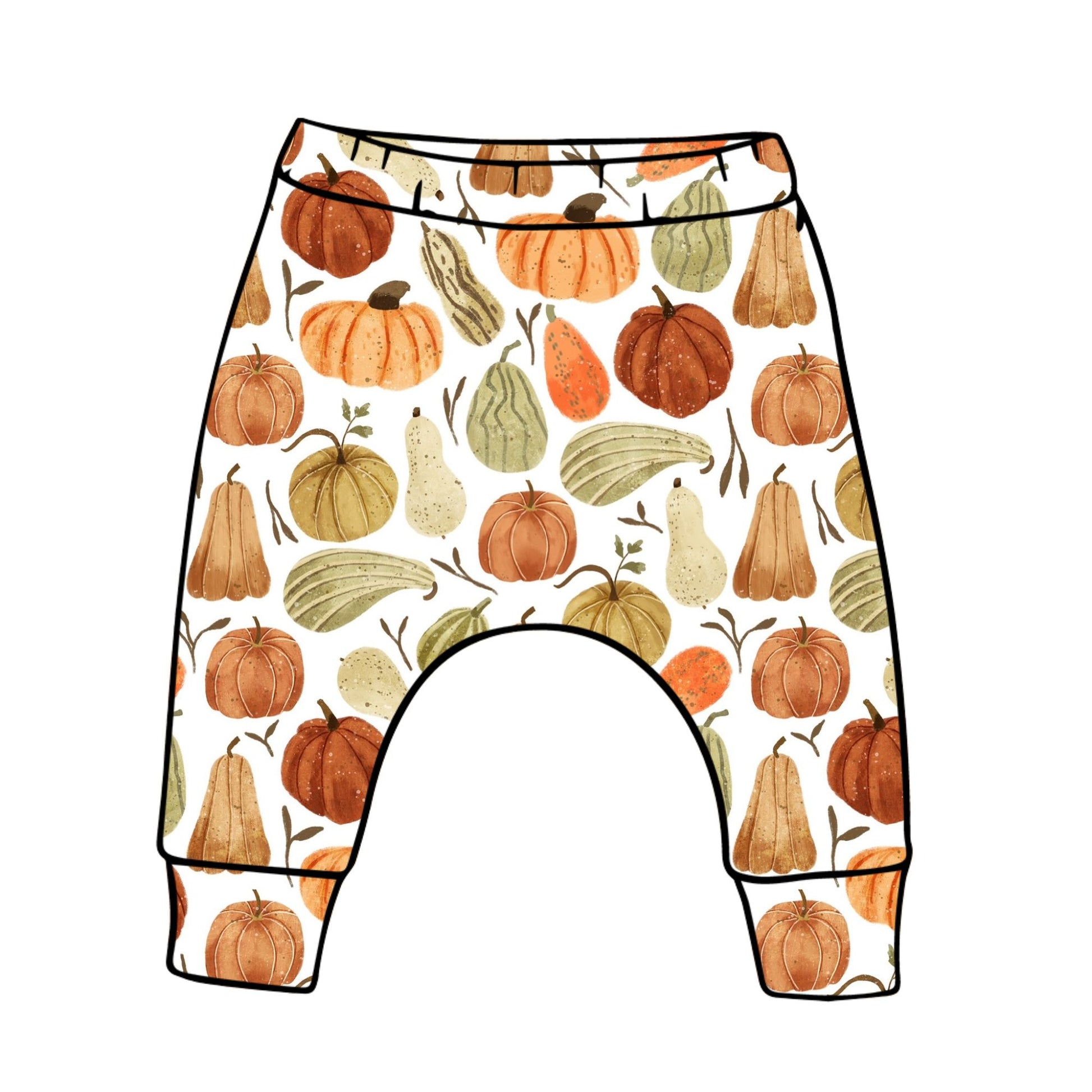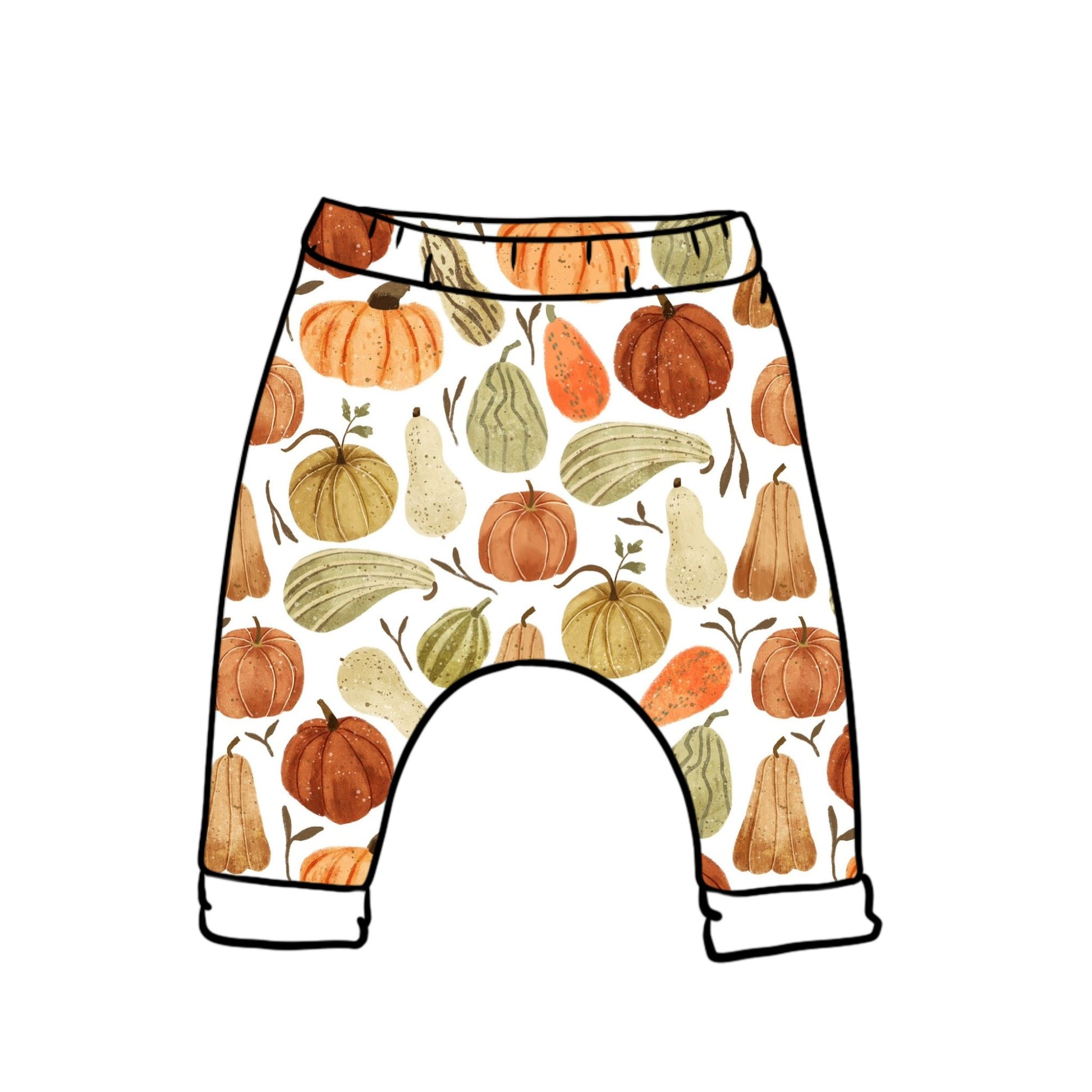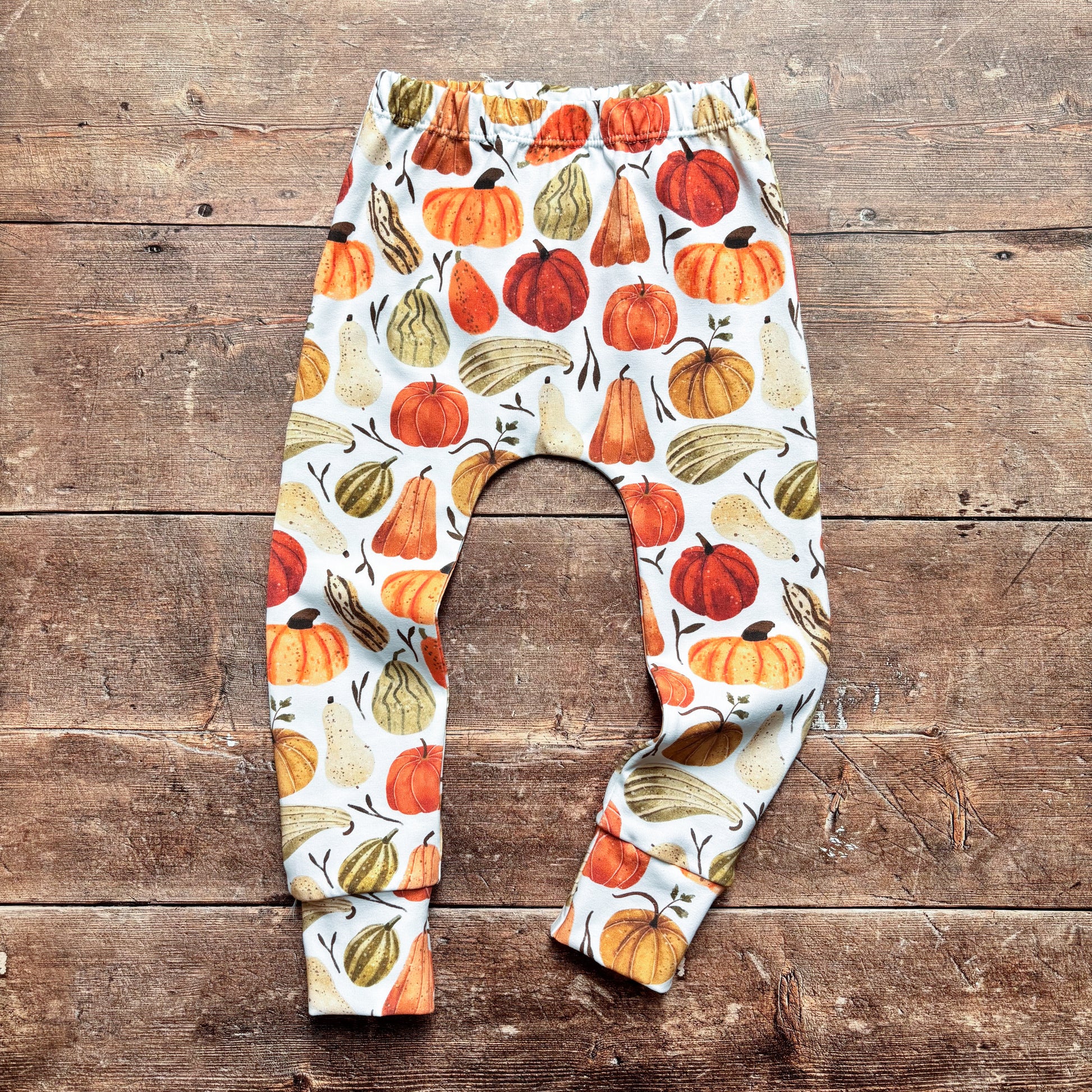 Let little ones move in comfort and seasonal style with our Autumn Squashes print Baby & Children’s Harem Trousers.