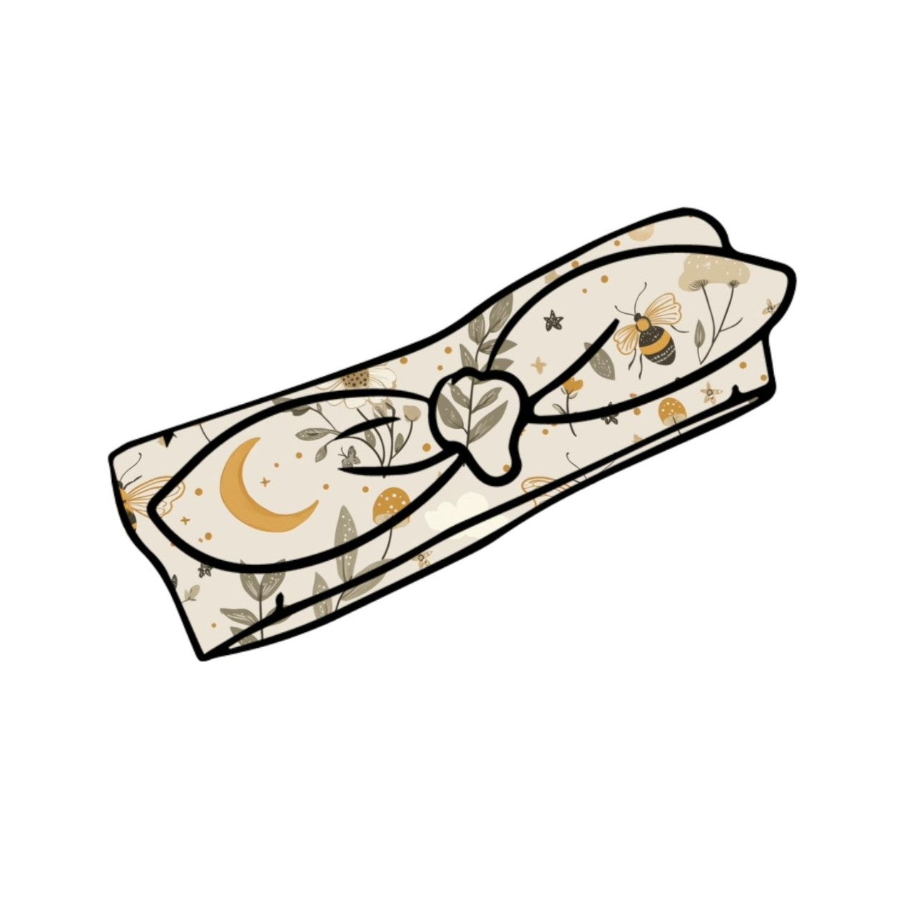 Add a touch of countryside charm with our Bees & Moon Baby & Children's Knot Bow Headband. Made from soft organic cotton, it features a whimsical design of delicate bees, crescent moons, and trailing leaves in gentle, nature-inspired tones.