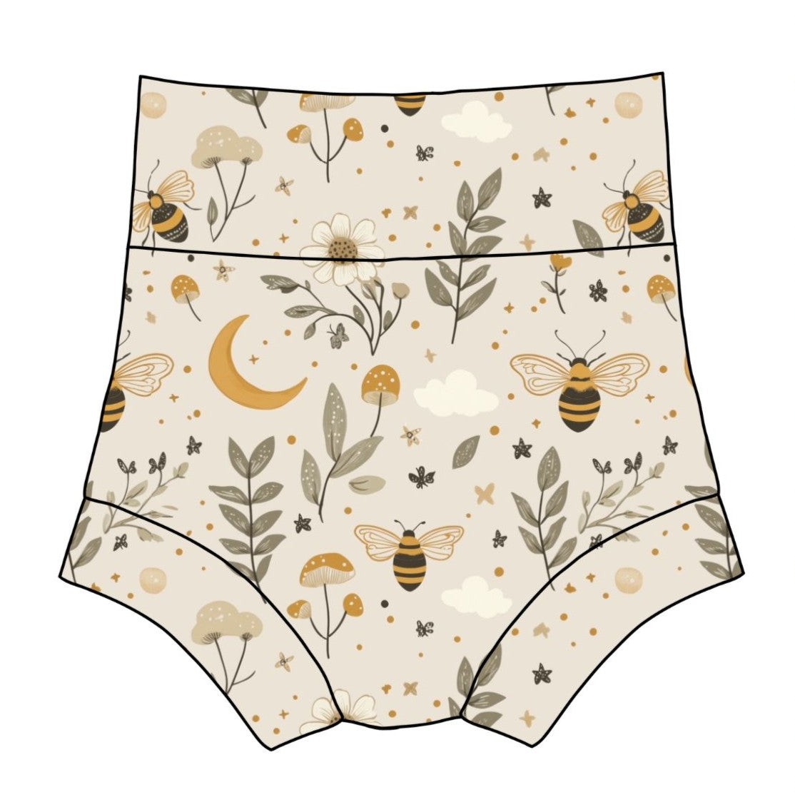 Add a touch of quiet magic to your little one’s wardrobe with our Bees & Moons print Baby and Children's Yoga Style Bloomer Shorts. This dreamy, nature-inspired design features hand-drawn bees, shimmering crescent moons, and soft, trailing leaves against a gentle, natural-toned background.
