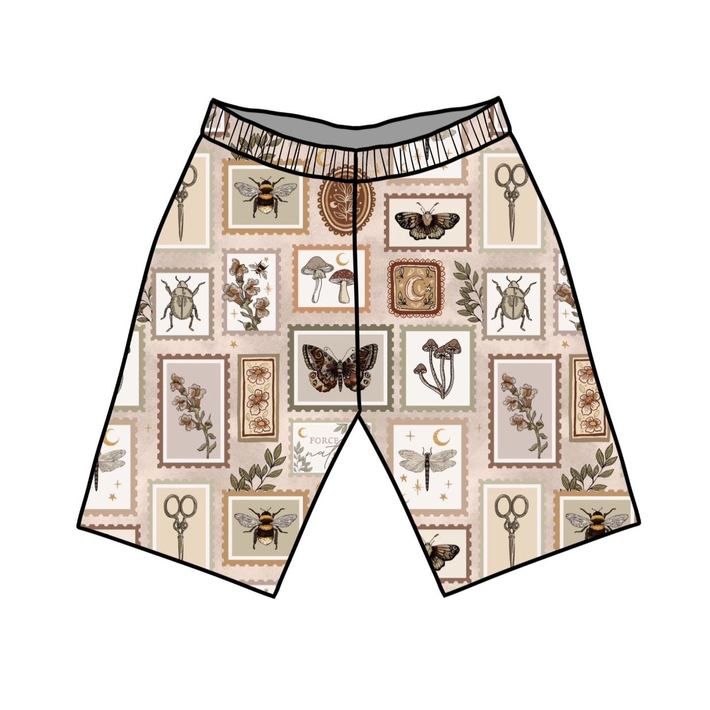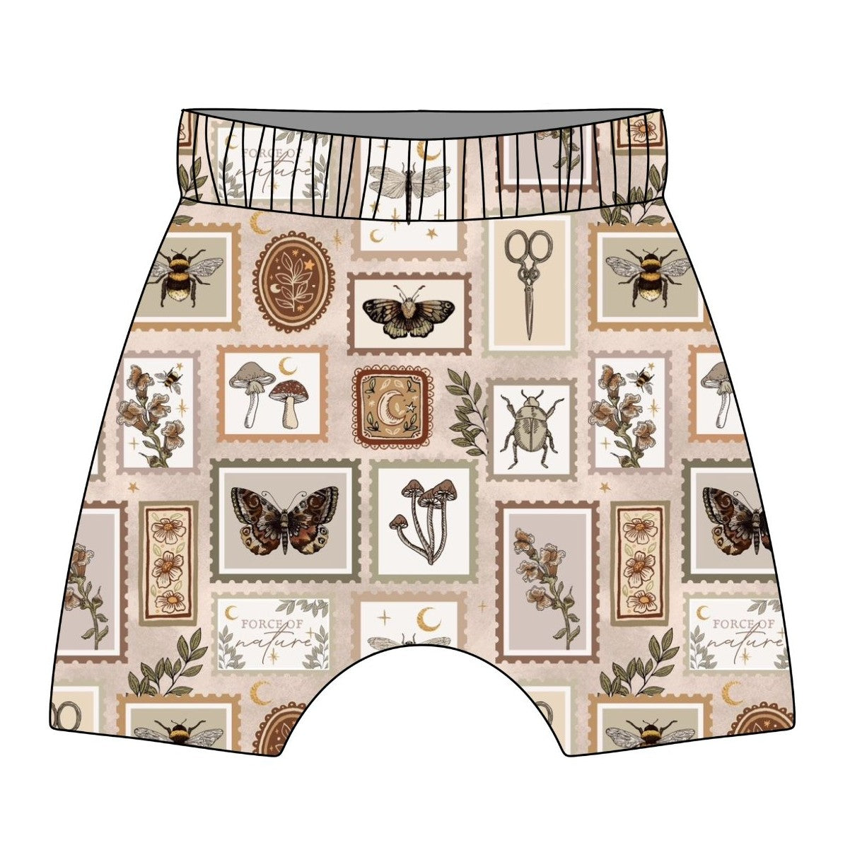 Bring a touch of curiosity and charm to your little one’s wardrobe with our Botany Stamps Baby and Children’s Hemmed Shorts. Featuring a vintage-inspired hand-drawn print with bees, butterflies, mushrooms, and botanical elements, they’re perfect for everyday adventures in every season.