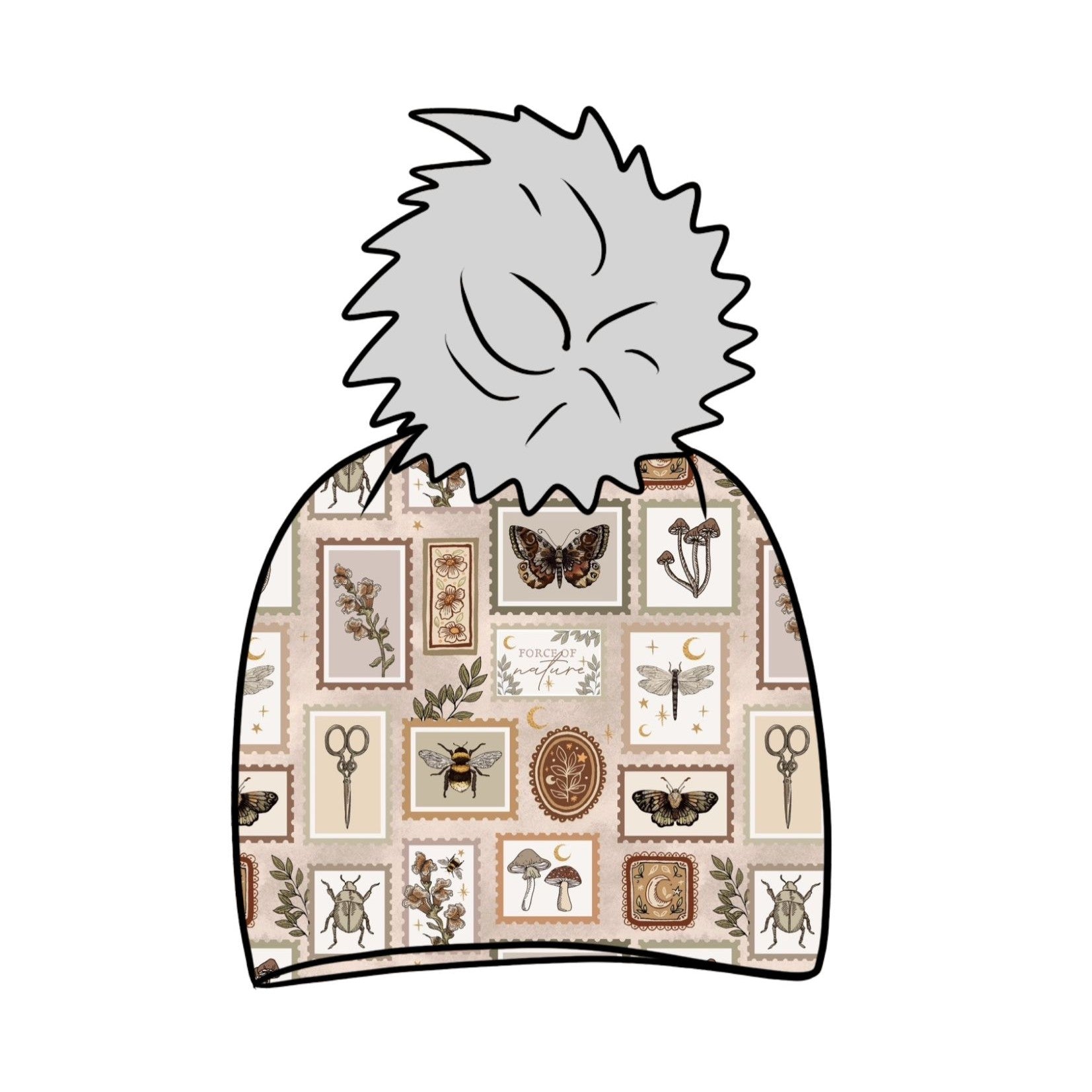 Keep little heads cosy in style with our Botany Stamps Baby & Children’s Bobble Hat. Featuring a vintage-inspired hand-drawn print of bees, butterflies, mushrooms, and botanical elements in soft natural tones, this soft organic cotton hat is reversible (pom on patterned side only) for two easy-to-style looks.