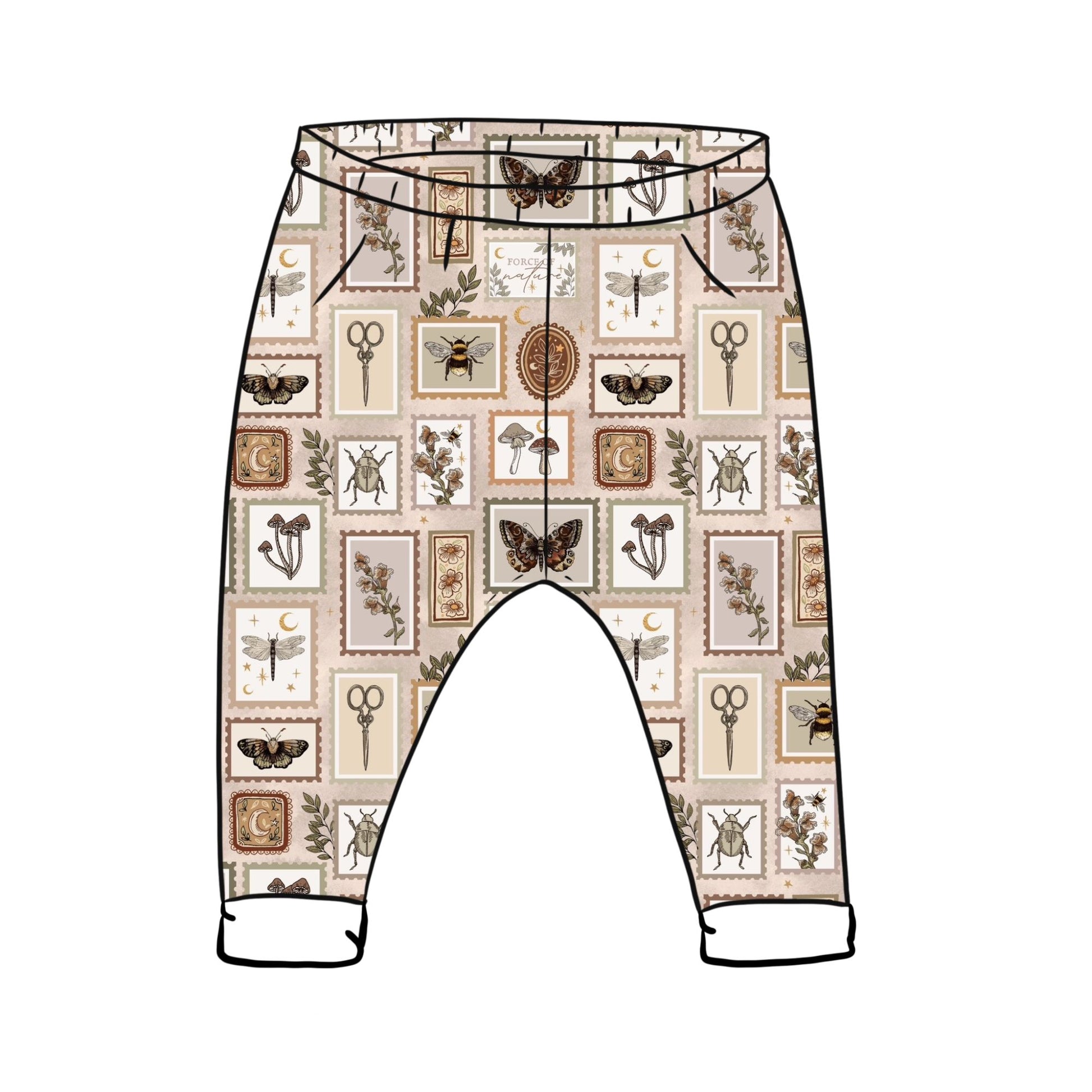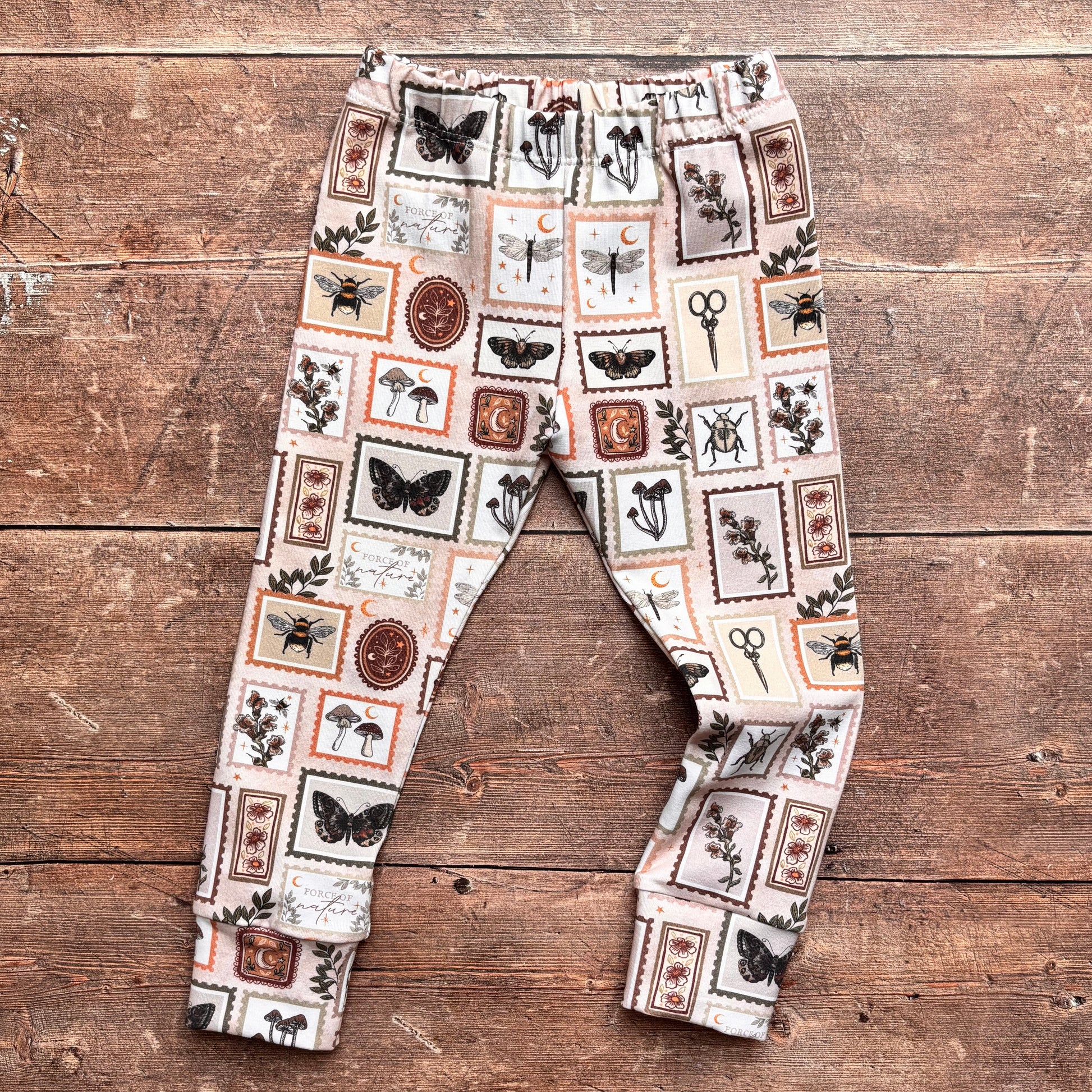 Let little ones explore in comfort and style with our Botany Stamps print Baby and Children's Legging Trousers. Made from soft, breathable organic cotton, these leggings feature a vintage-inspired hand-drawn print of bees, butterflies, mushrooms, and botanical elements in warm, earthy tones. Perfect for everyday adventures, outdoor play, and relaxed days at home.