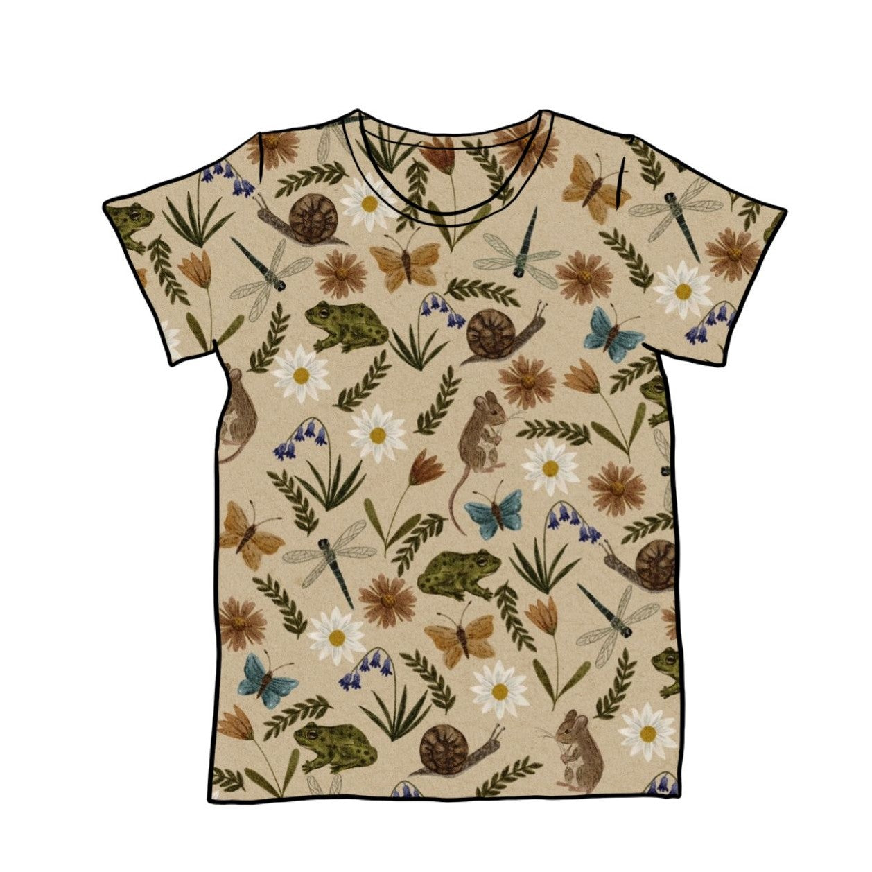 Pretty and practical, our Busy Meadow print Short Sleeve Baby and Children's T-Shirt is perfect for everyday wear or special occasions. Made from soft organic cotton, it features a whimsical meadow print with woodland creatures, wildflowers, and butterflies in gentle, nature-inspired tones. With short sleeves and a relaxed, comfortable fit, this comfy tee is perfect for playdates, park adventures, and everything in between. A versatile essential for little explorers.