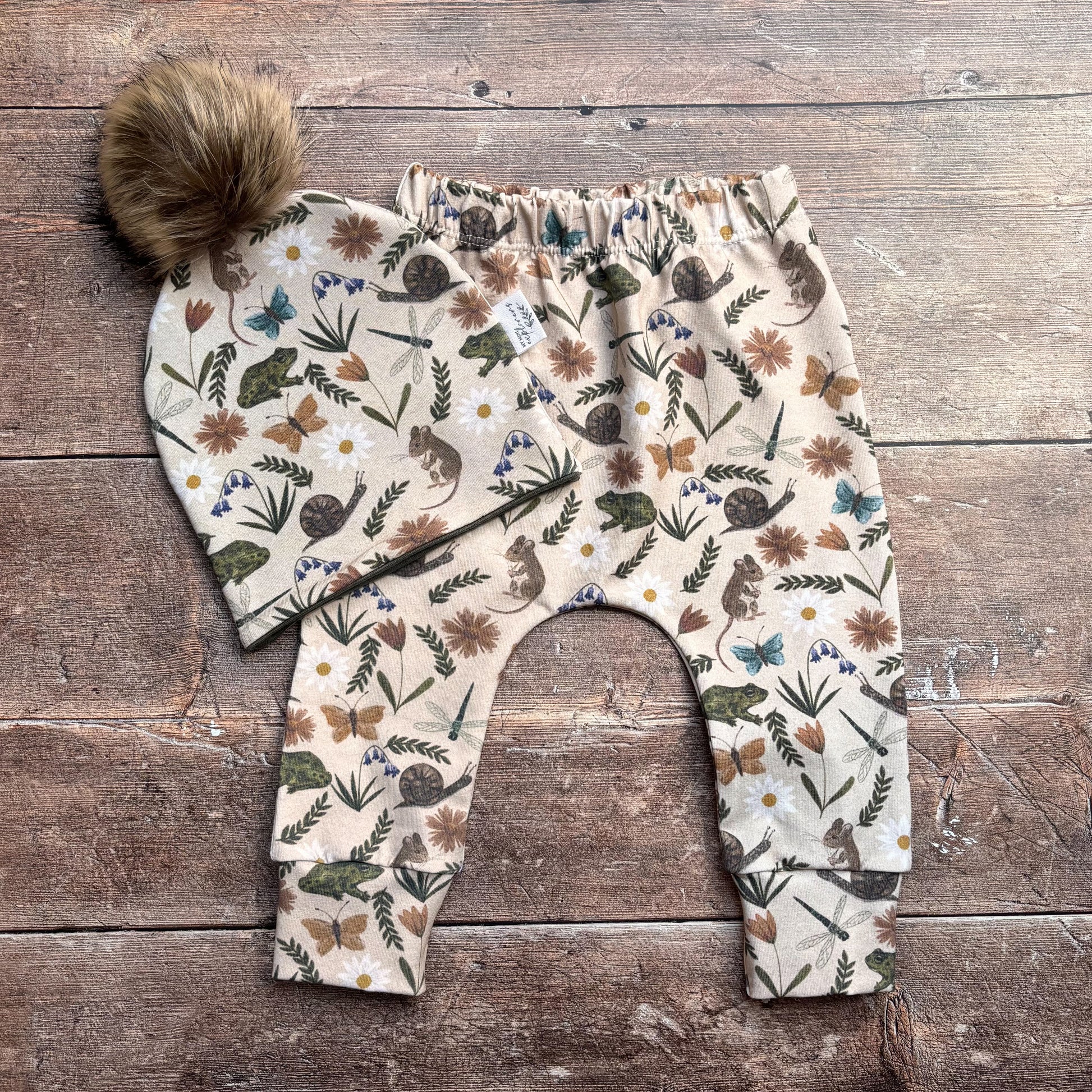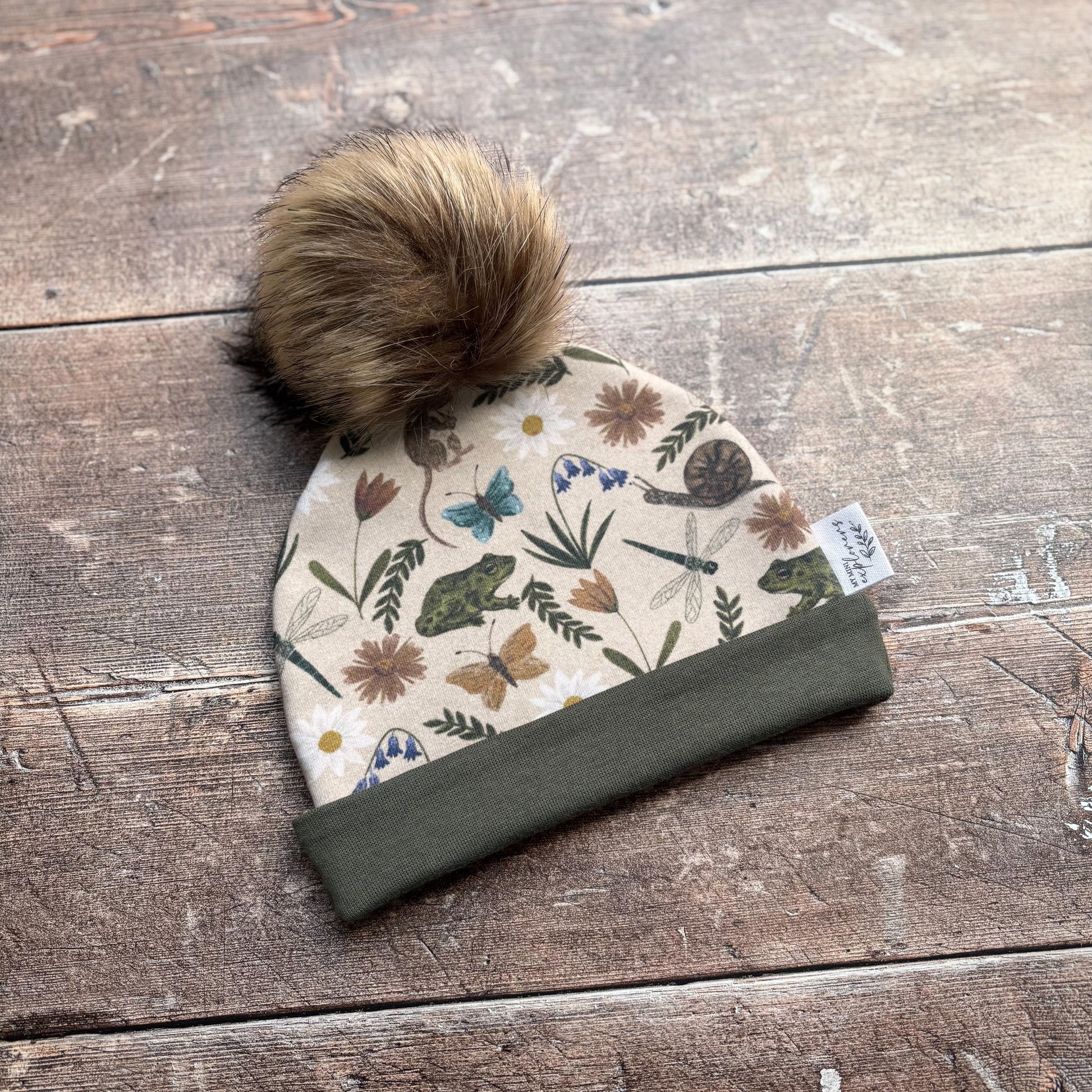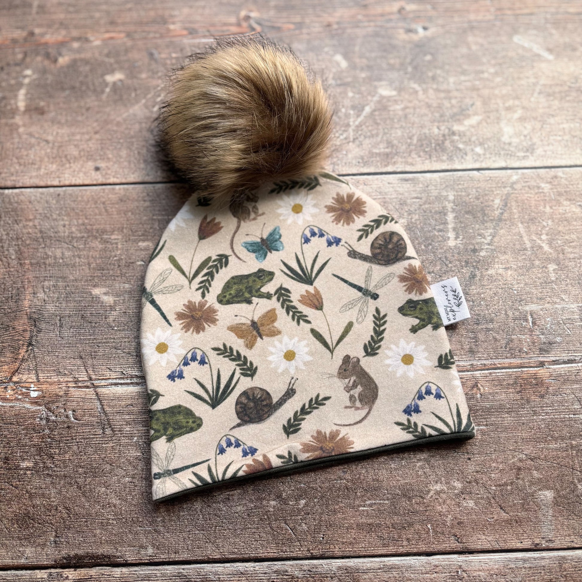Keep little heads cosy in style with our Busy Meadow Baby & Children's Hat. Featuring a charming, hand-drawn meadow print with woodland creatures and wildflowers in soft, nature-inspired tones, this adorable organic cotton hat is perfect for adding a touch of countryside charm while keeping your little one warm and comfortable. Designed to be reversible (pom only on patterned side), it offers two looks in one — making it easy to mix and match with multiple outfits.