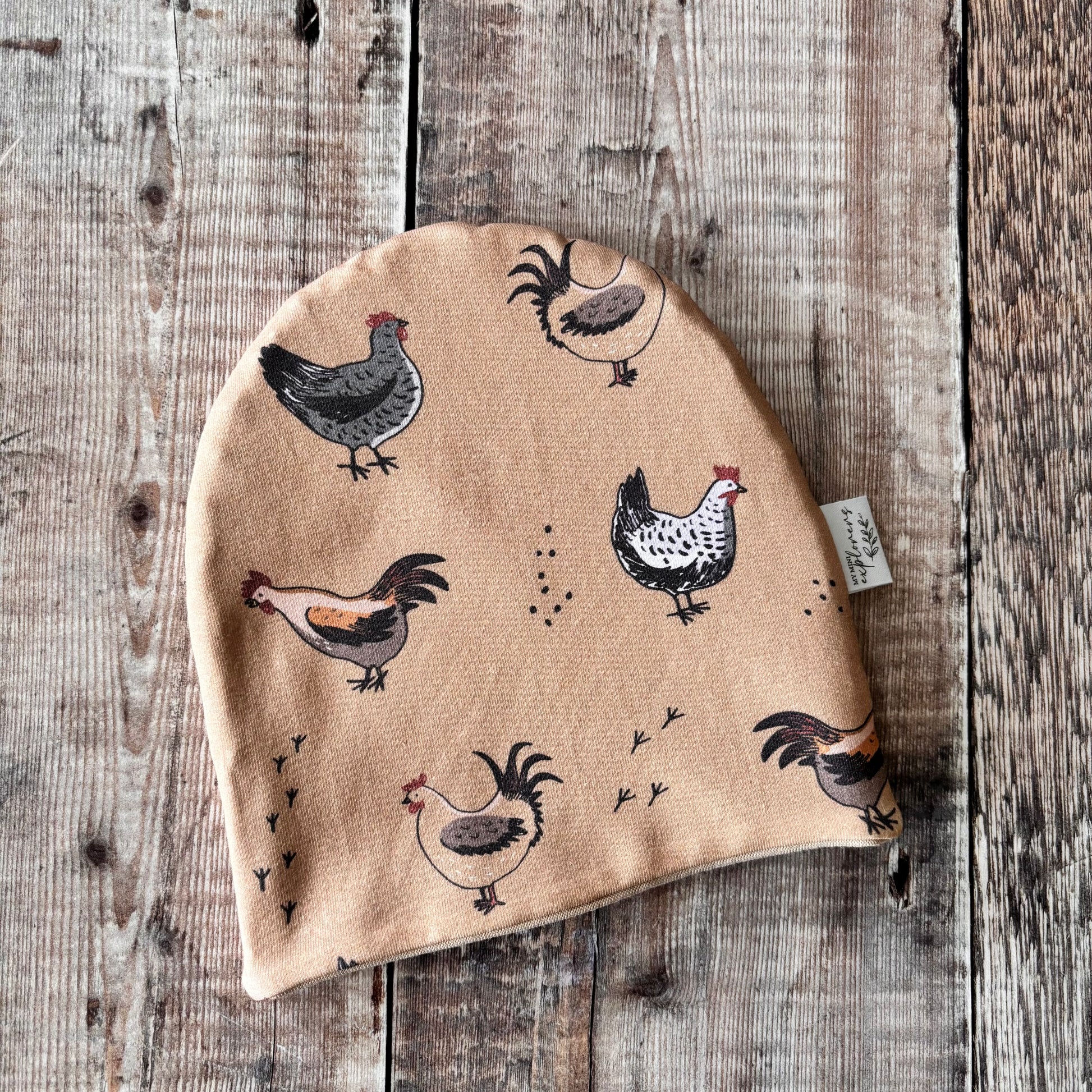 Chickens Bobble Hat 0-6m (oat inside) NO POM POM