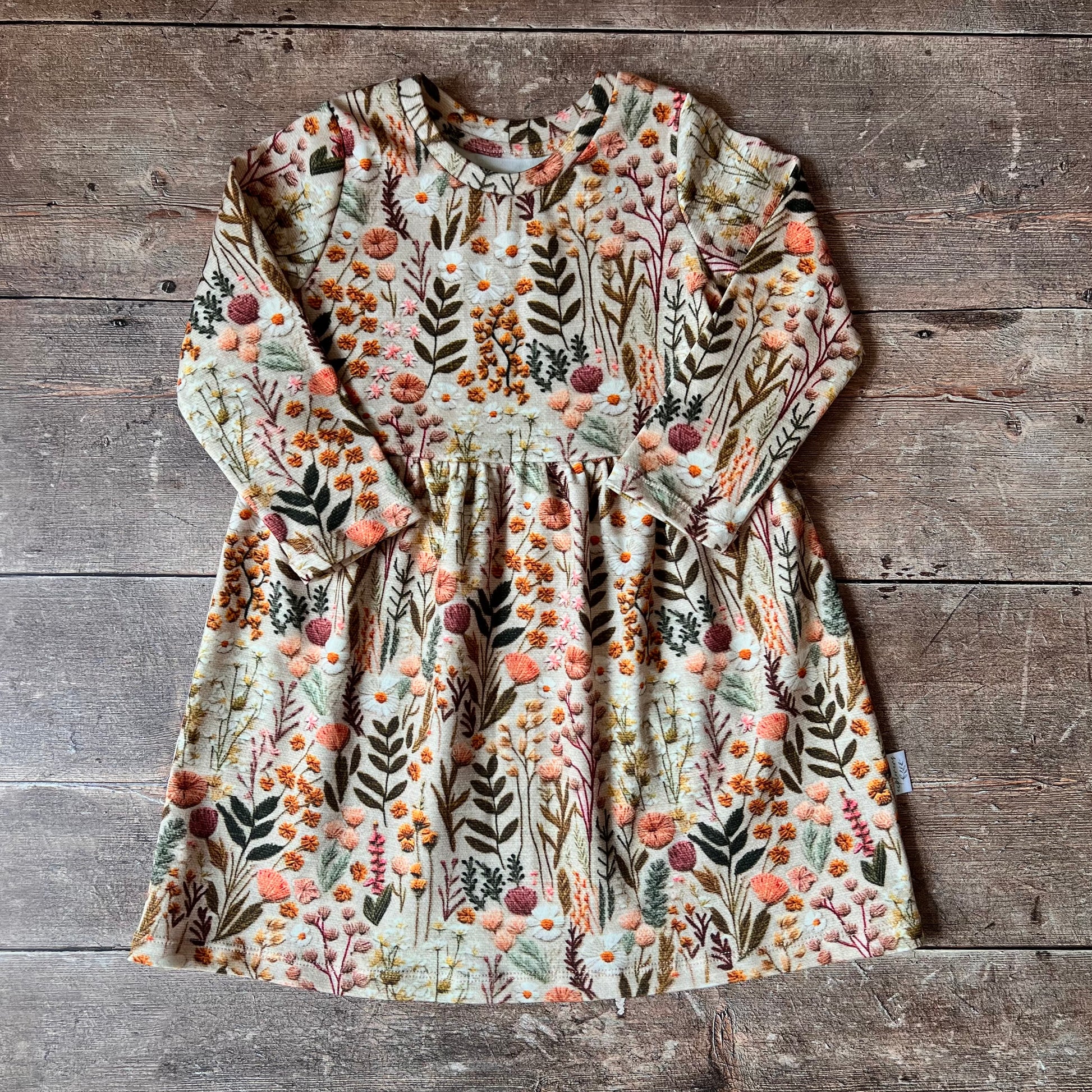 Made from soft, breathable organic cotton, this charming dress features a delicate embroidered-look floral print with pretty pink, soft peach, and warm earth-tone flowers. With its long sleeves and relaxed, comfortable fit, it’s an easy-to-wear outfit for babies and toddlers that blends timeless style with cosy, effortless comfort.