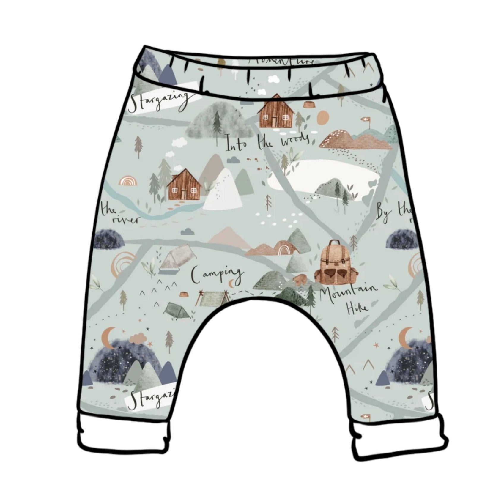 Let little ones move with ease with our Explorer Baby and Children's Harem Trousers. Made from soft organic cotton and featuring our adventure-inspired Explorer print with rivers, woodlands, and mountain trails in gentle, earthy tones, these harems are perfect for everyday adventures, countryside walks, and outdoor play.