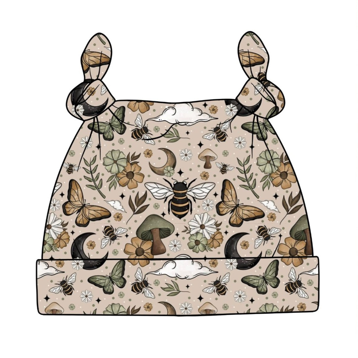 Keep tiny heads cosy and cute with our Fall Bees print Baby Knotted Hat, made from soft organic cotton and featuring a whimsical hand-drawn print with bees, butterflies, mushrooms, and florals in warm autumn tones.