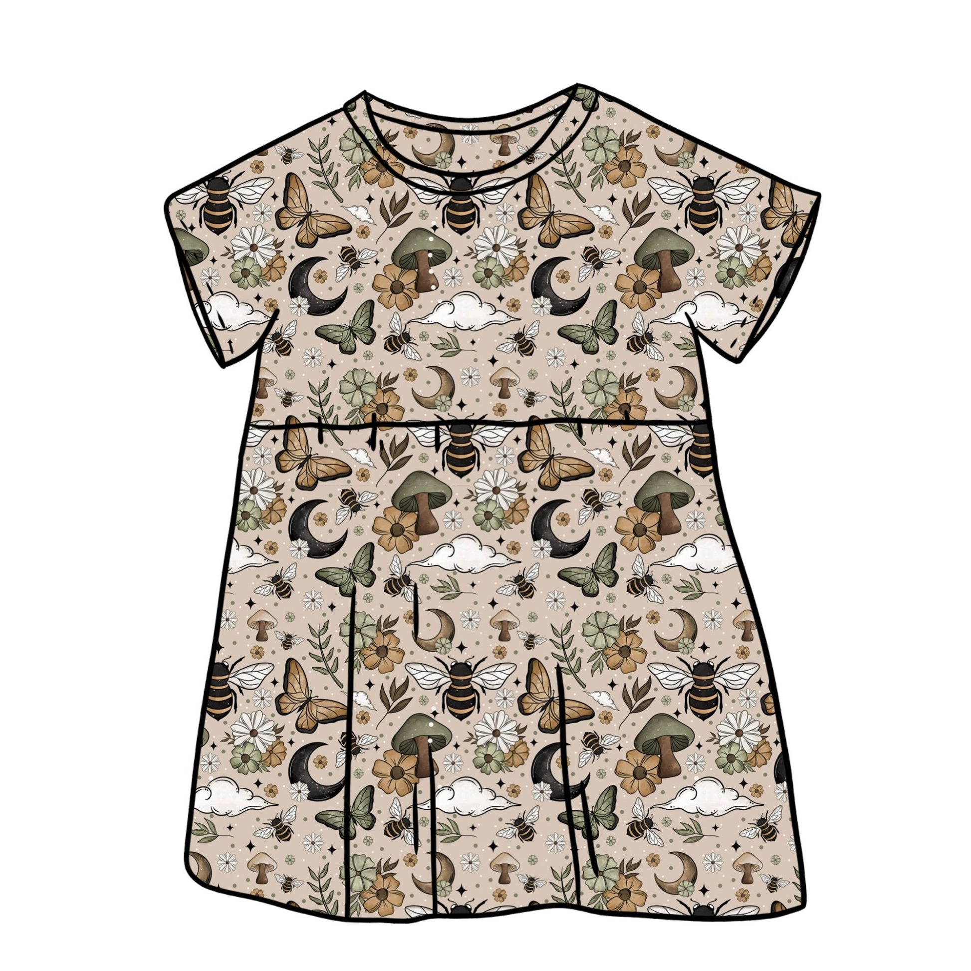 Made from soft, breathable organic cotton, this charming dress features a whimsical print with hand-drawn bees, butterflies, mushrooms, and autumn florals, its the perfect print for countryside family days out. With its short sleeves and relaxed, comfortable fit, it’s an easy-to-wear outfit for babies and toddlers that combines style and comfort. Ideal for spring, summer, and layering in cooler months, this organic baby dress is a wardrobe essential your child will love.
