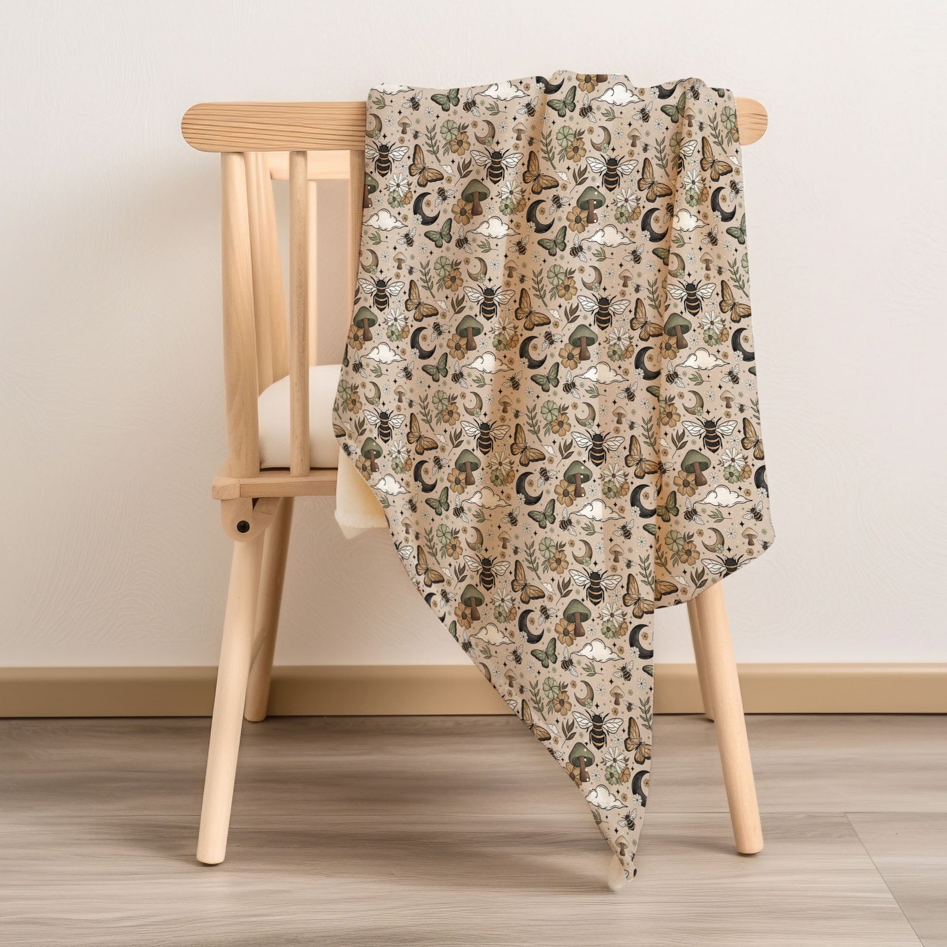 Wrap your little one in comfort with our luxuriously soft Fall Bees print Baby Blanket, beautifully adorned with a whimsical print featuring hand-drawn bees, butterflies, mushrooms, and autumn florals. Made from the plushest of the fleece family, aptly named 'cuddle fleece'. This gorgeous fabric will keep your baby lovely and warm on your outdoor adventures or at home during the cooler months. A beautiful, timeless essential for every nursery and beyond.