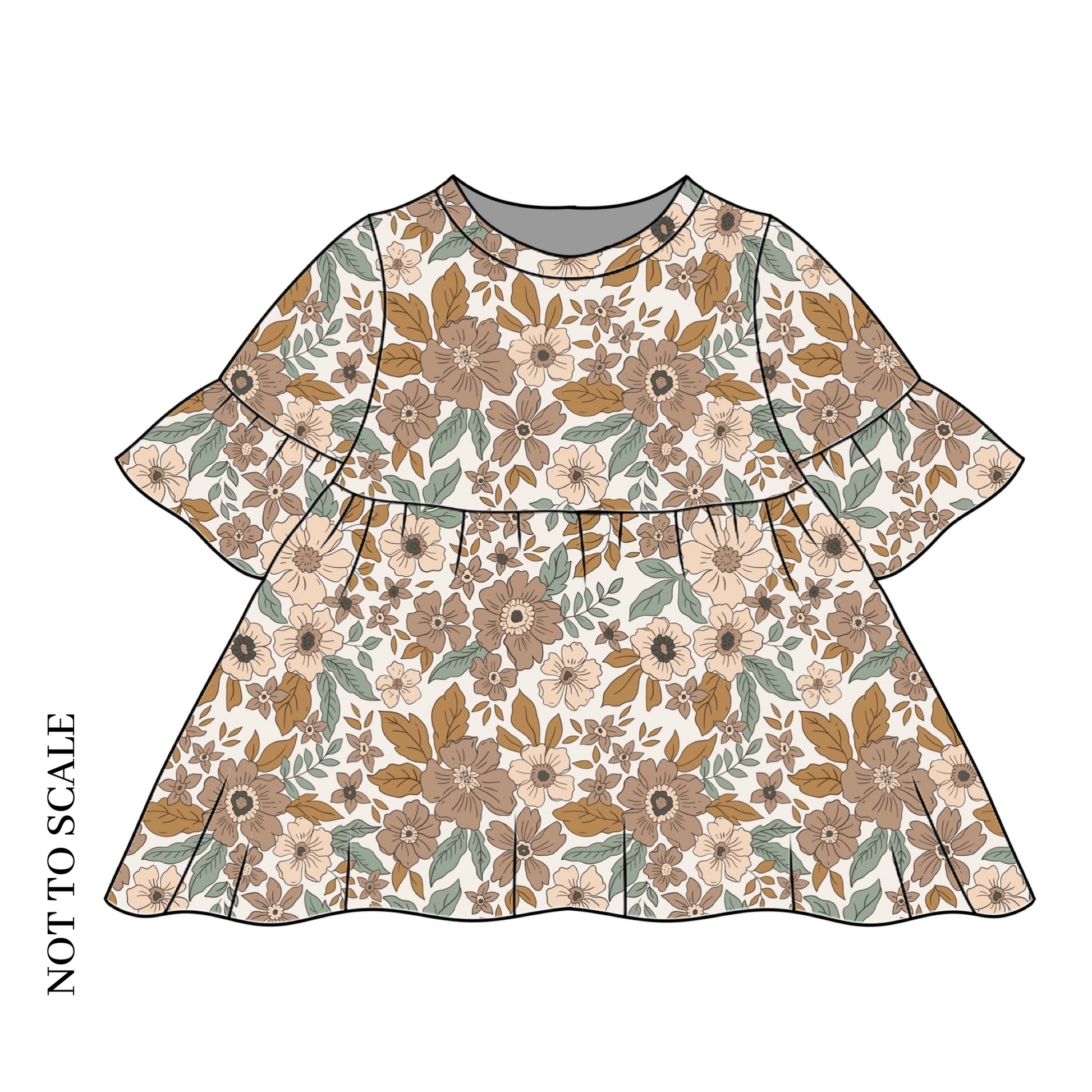 Made from soft, breathable organic cotton, this charming dress features a beautiful folk-inspired floral print in soothing shades of mink brown, sage green, and soft earth tones. With its 3/4 length frill sleeves and relaxed, comfortable fit, it’s an easy-to-wear outfit for babies and toddlers that blends timeless, vintage-inspired style with cosy, effortless comfort.