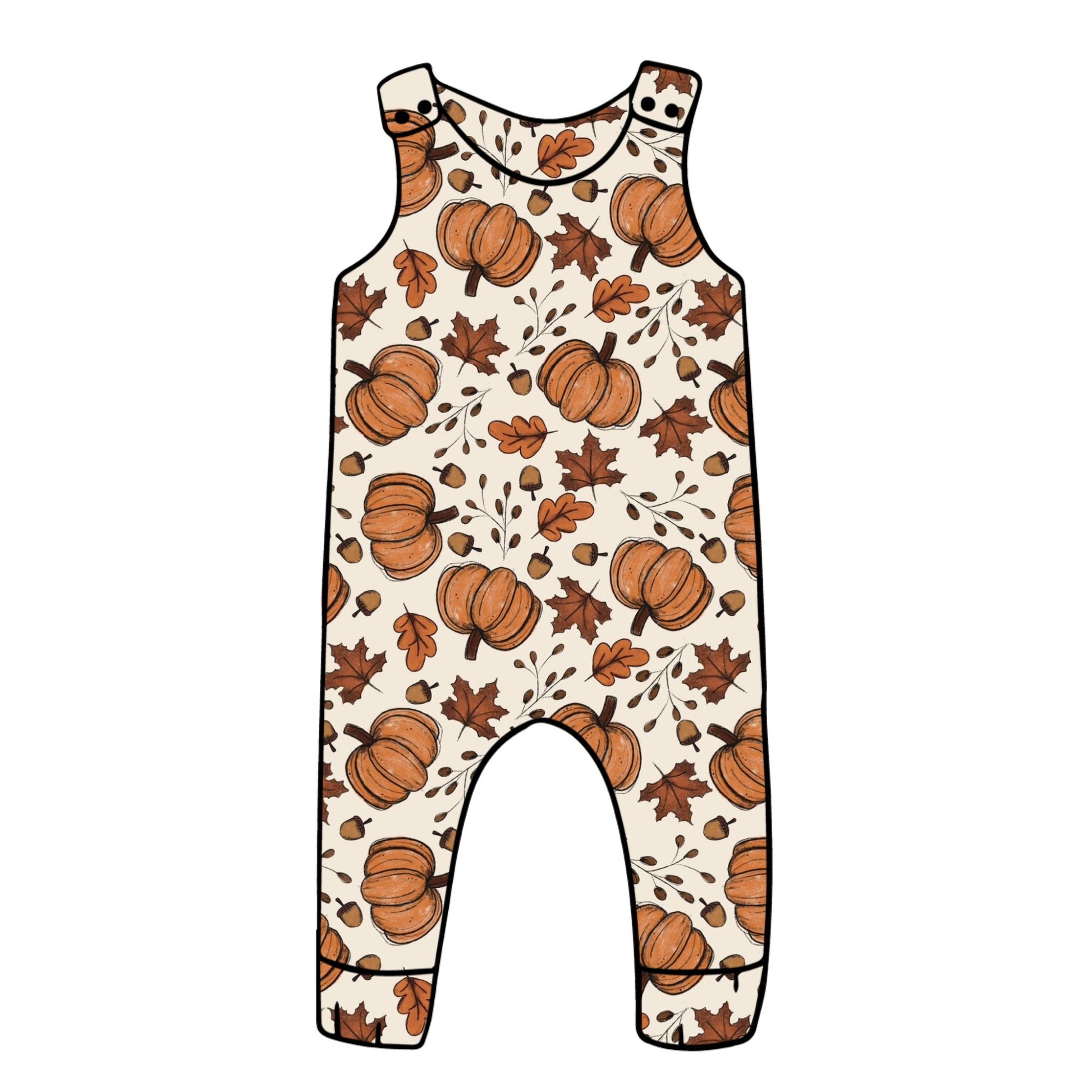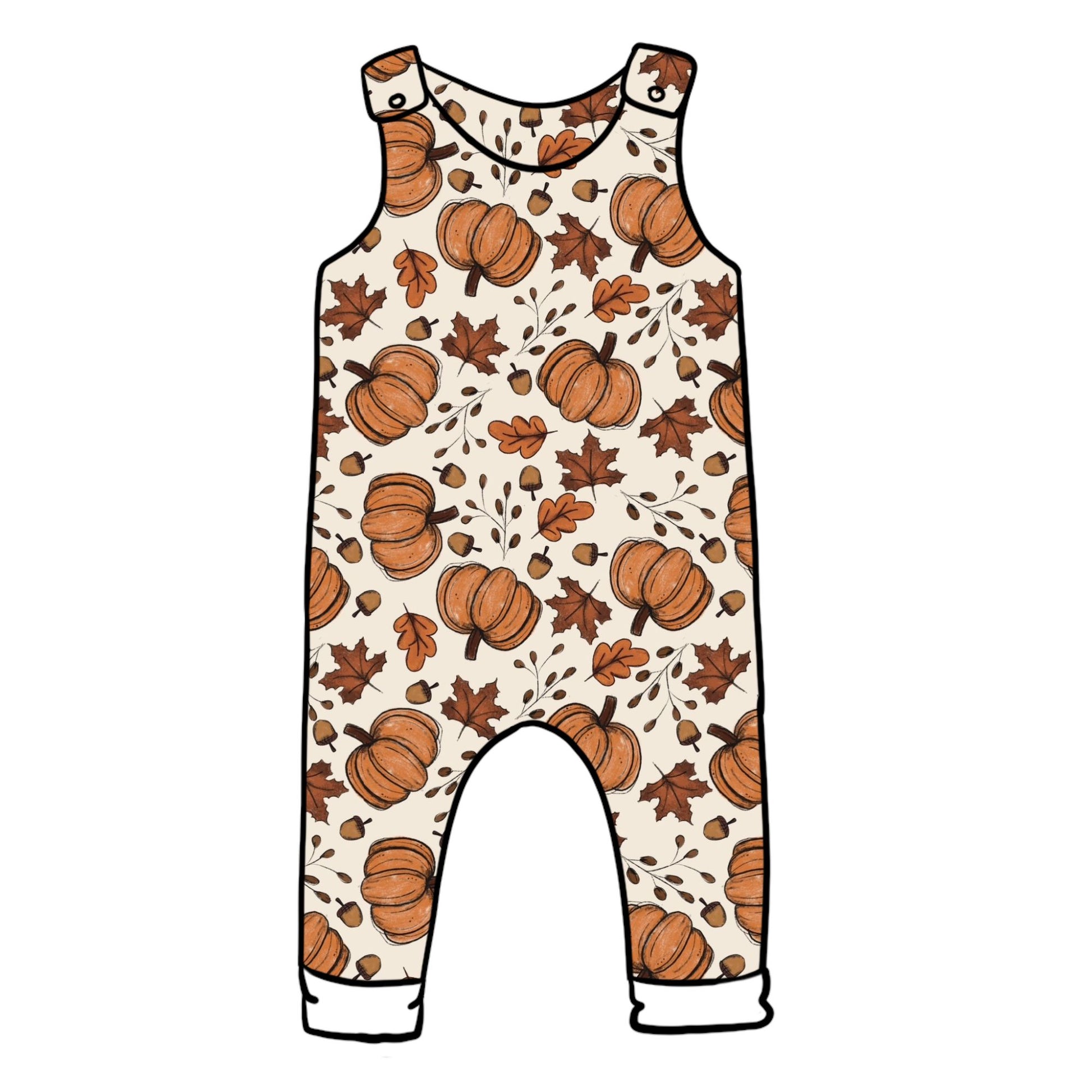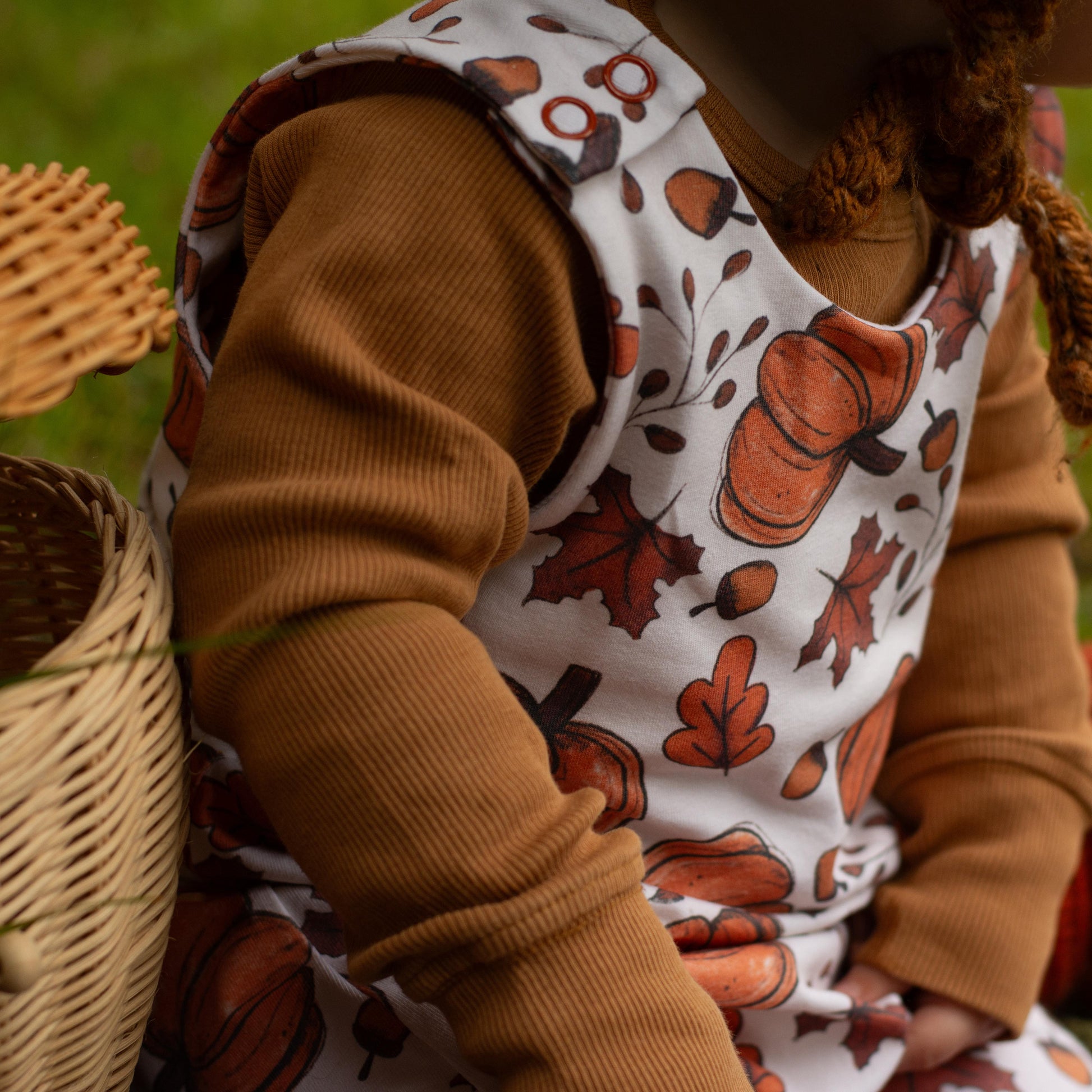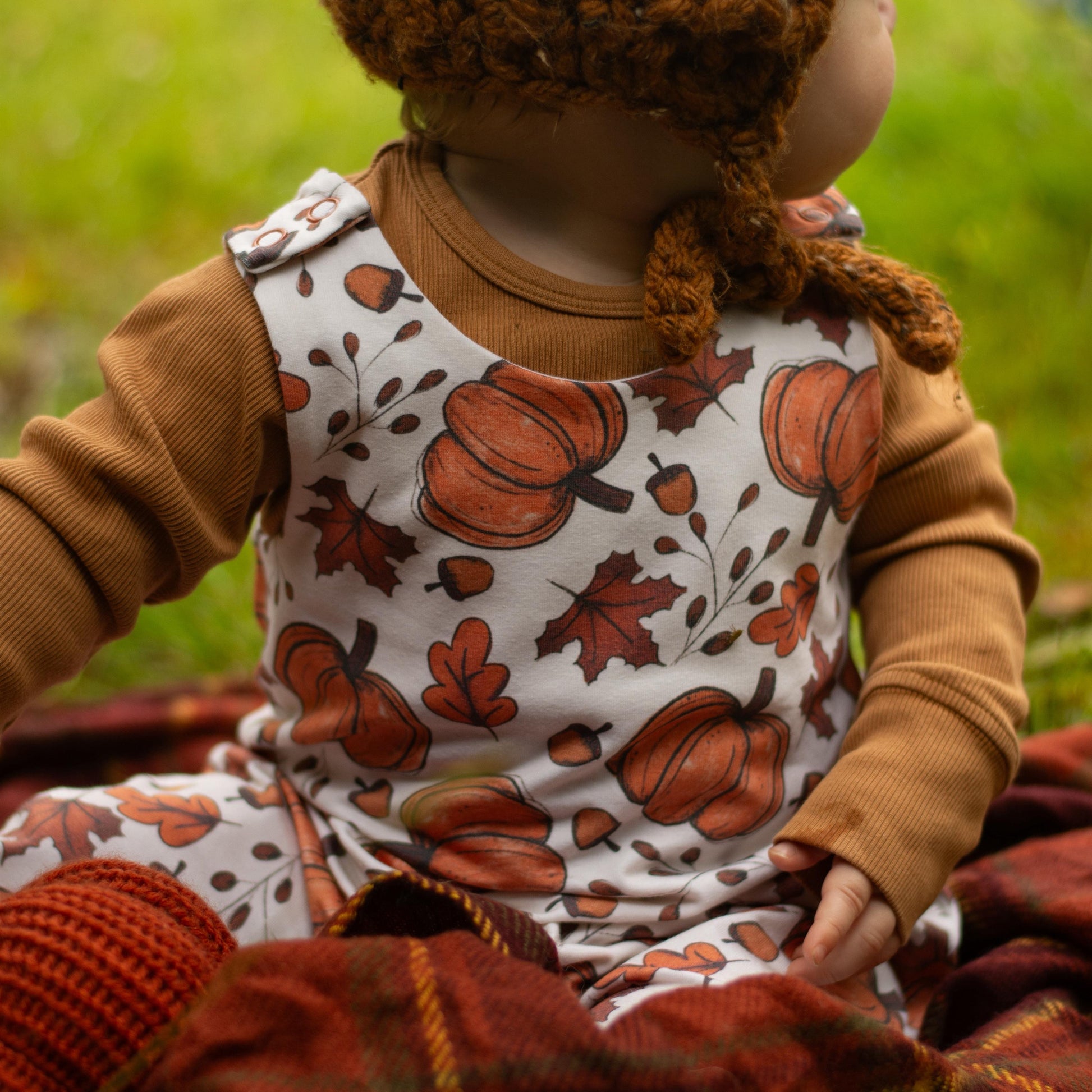 Featuring our Harvest Vibes print — a hand-drawn autumnal design featuring pumpkins, acorns, and leaves in rich, earthy tones — this soft organic cotton romper is perfect for pumpkin picking adventures and festive Halloween parties.
