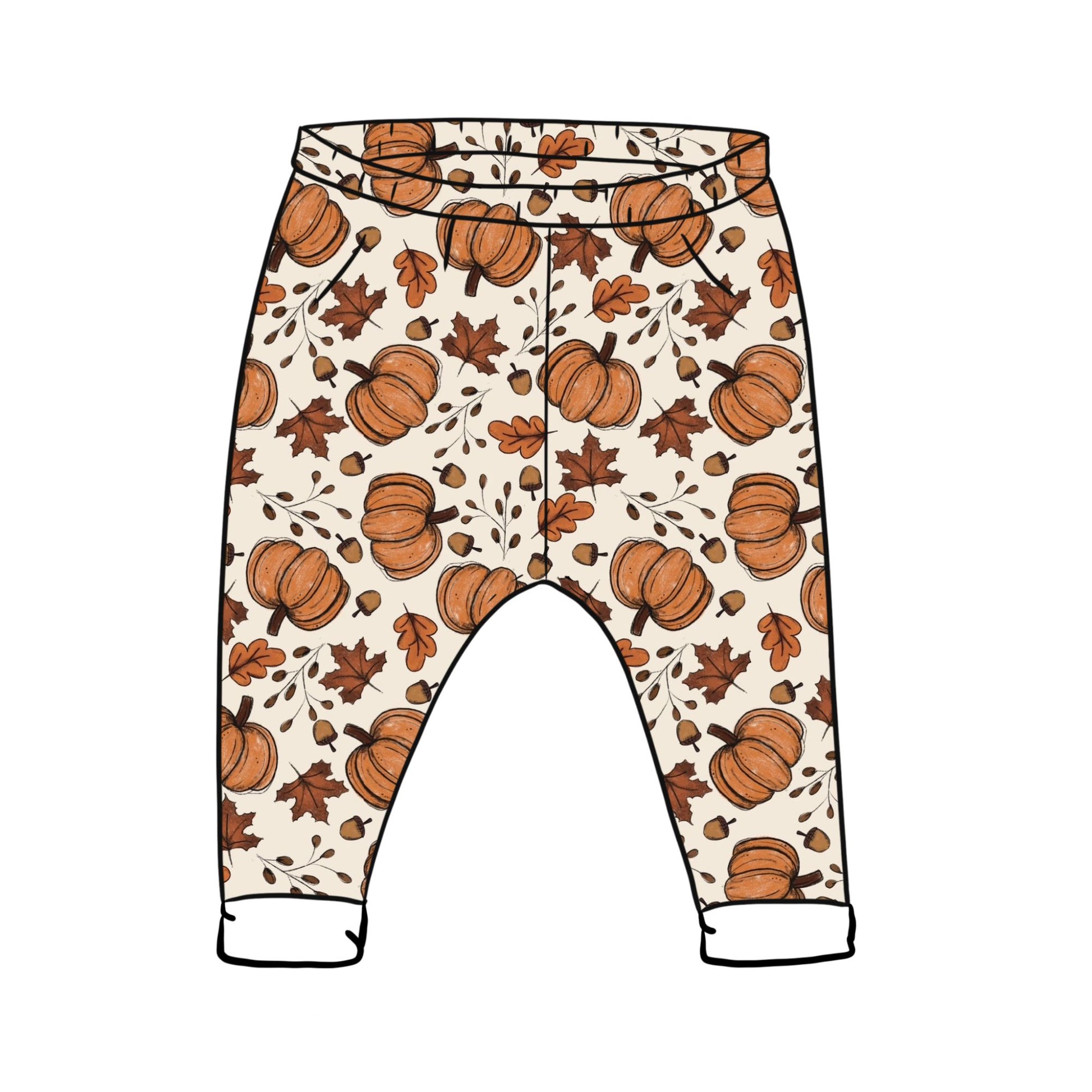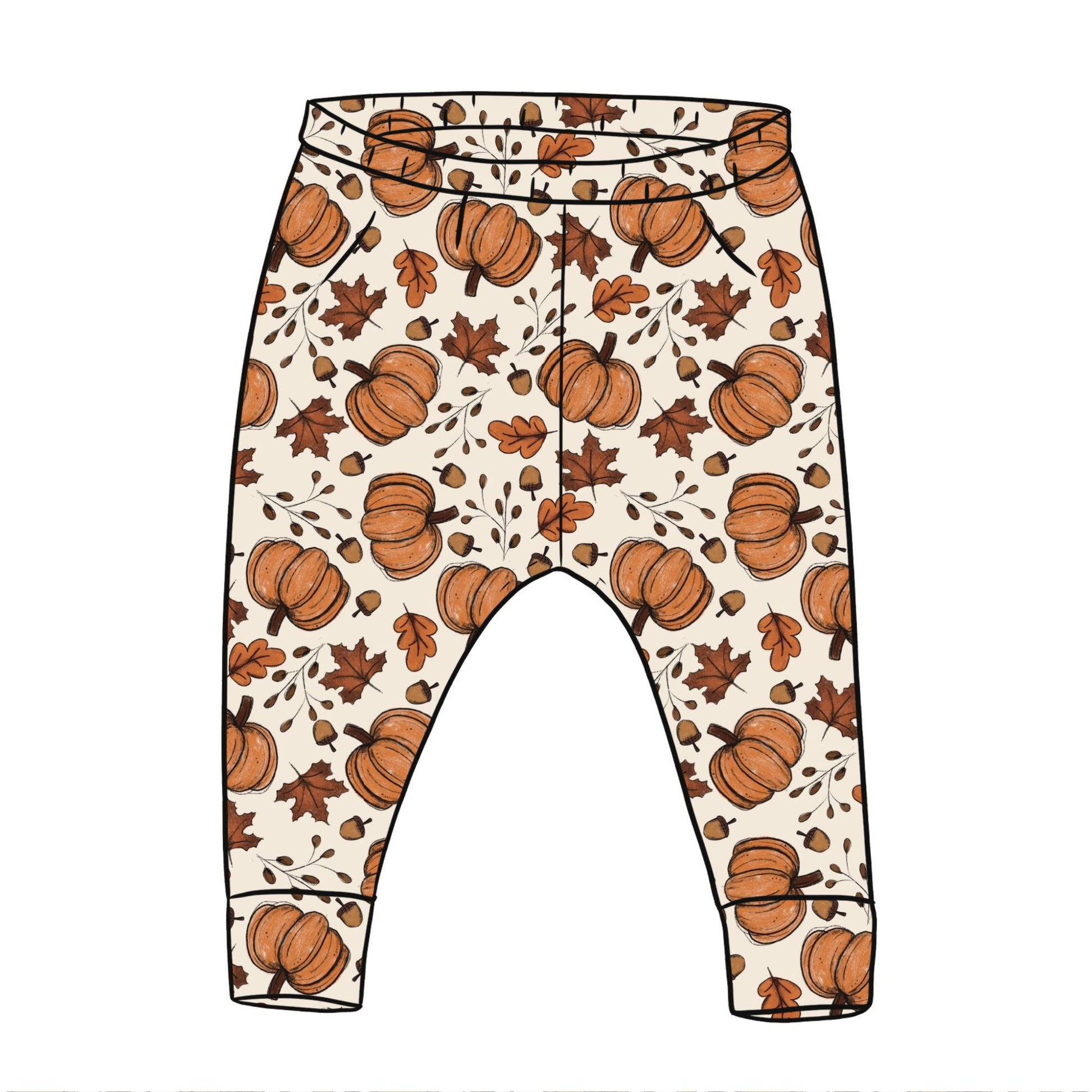 Wrap your little ones in the warm tones of autumn with our Harvest Vibes print Baby and Children’s Legging Trousers. Made from soft, breathable organic cotton, these leggings feature our Harvest Vibes hand-drawn print of pumpkins, acorns, and leaves on a pale cream background. Ideal for pumpkin picking, everyday play, and seasonal outings, they add cosy style to any little one’s wardrobe.