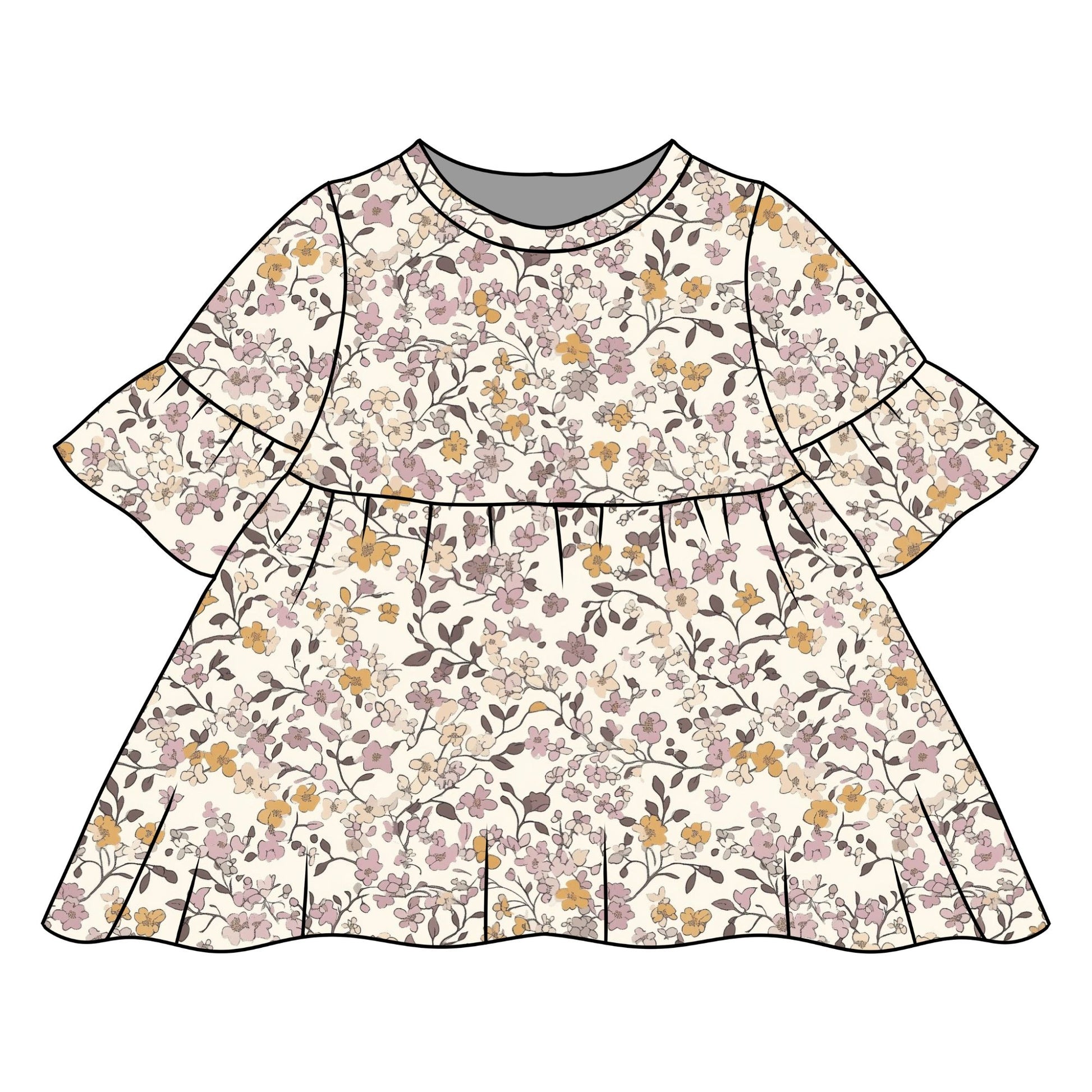 Lilac & Caramel Ditsy Floral Child & Baby Frill Sleeve Dress