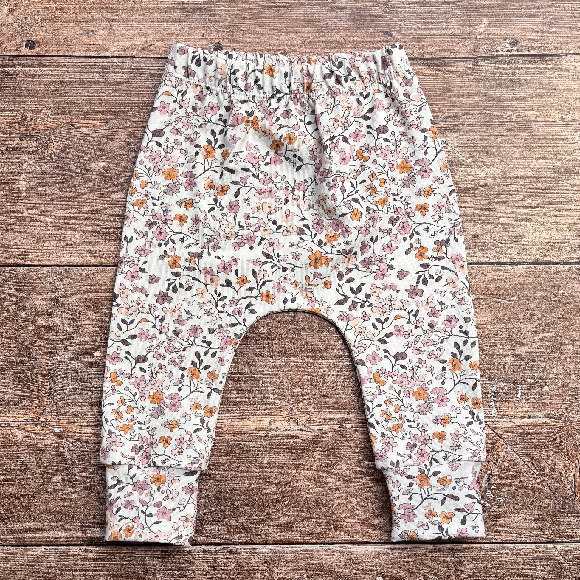 Keep little ones comfy and carefree with our Lilac & Caramel Ditsy Floral Baby and Children's Harem Trousers. Made from soft organic cotton and decorated with a dainty floral print in warm lilac and caramel tones, these relaxed-fit trousers are perfect for everyday adventures.
