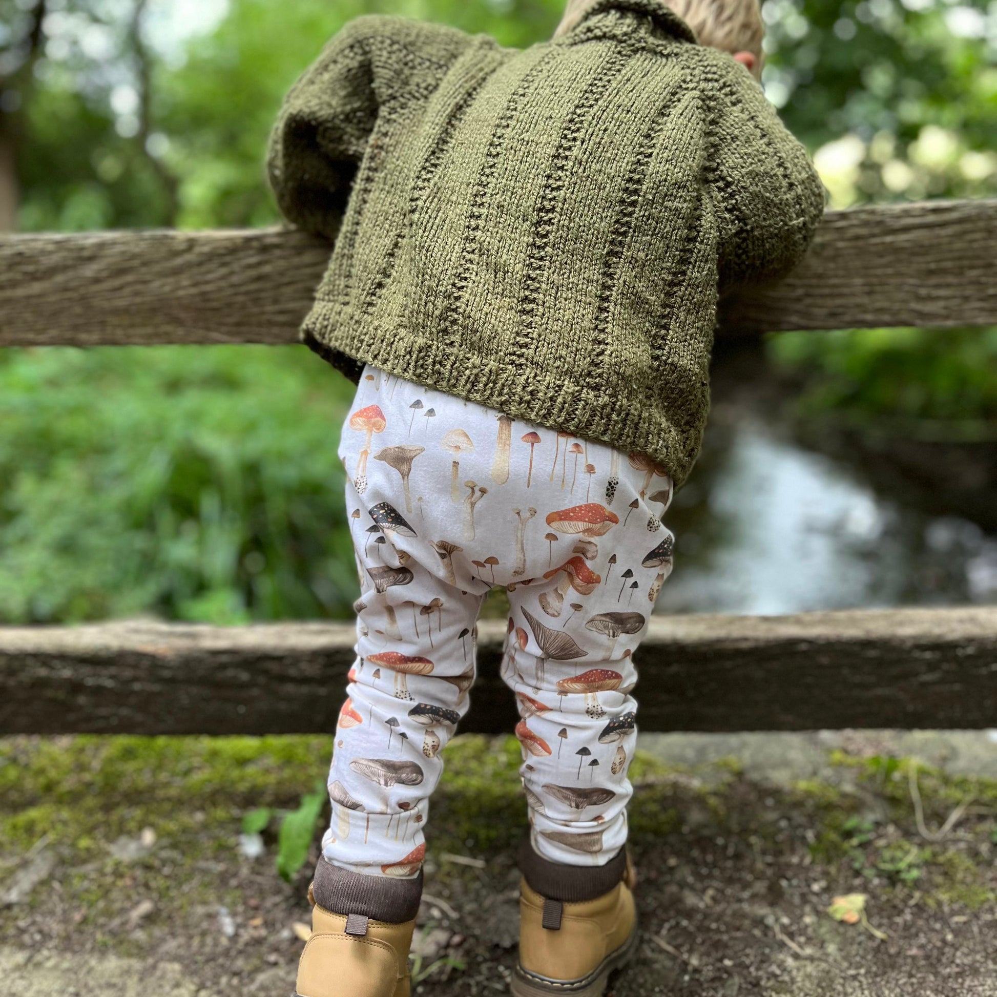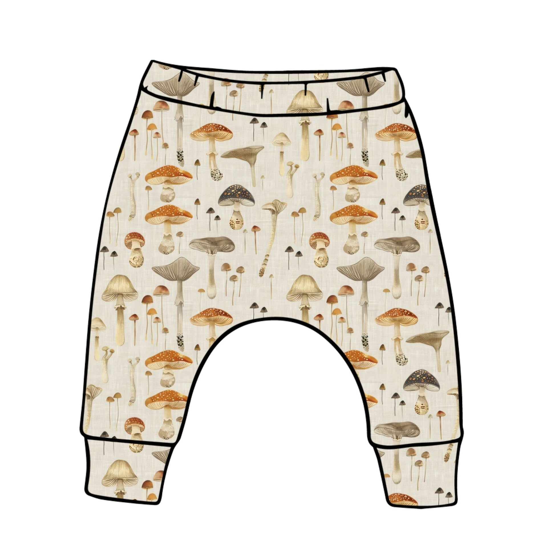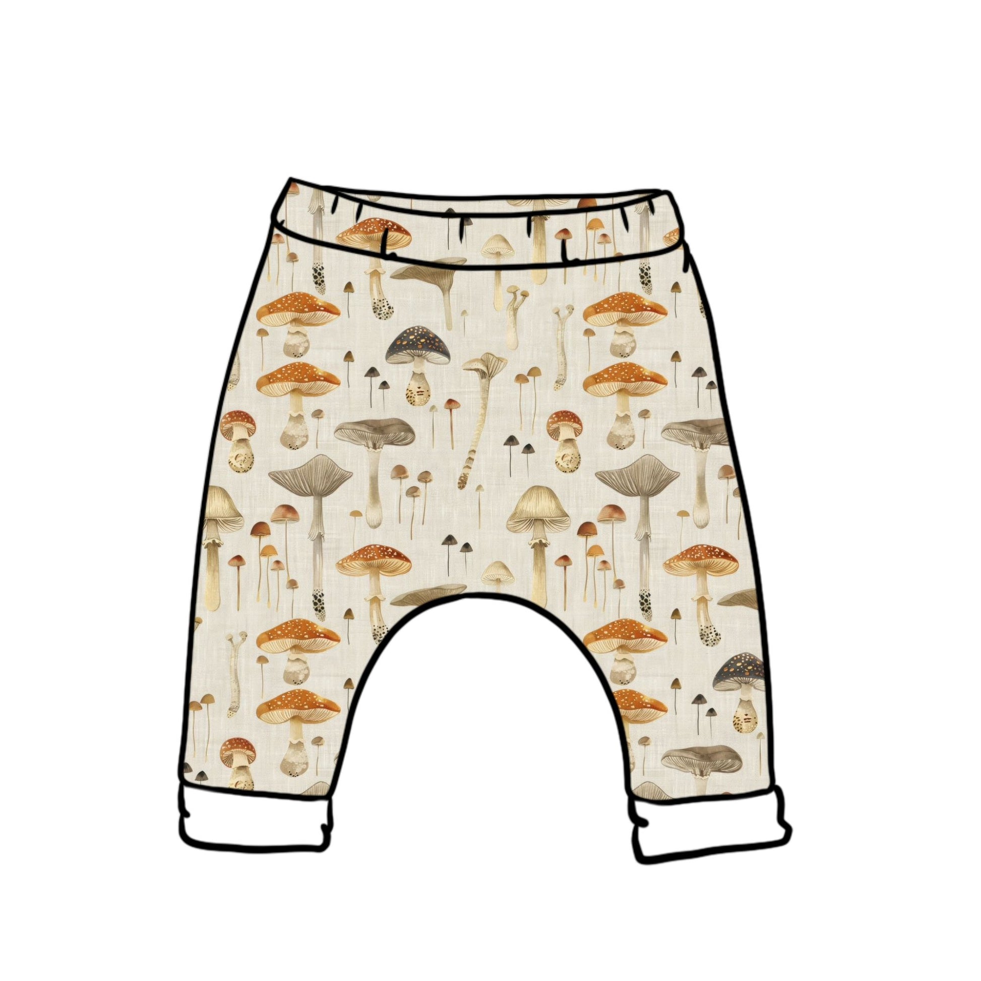 Let little ones move in comfort with our Linen Mushrooms Baby and Children's Harem Trousers. Made from soft organic cotton, these relaxed-fit trousers feature a vintage-inspired hand-drawn print of mushrooms and toadstools in warm, nature-inspired tones on a pale linen-look background. Perfect for everyday adventures and outdoor play.