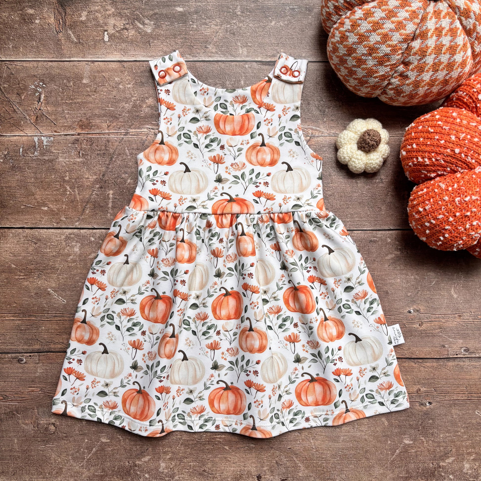 Bring a cosy seasonal touch to your little one’s wardrobe with our Pumpkin Patch print Baby & Children’s Pinafore Dress.