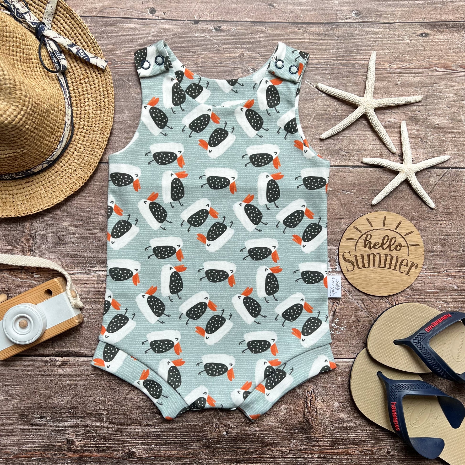 Beautifully handmade from organic cotton jersey knit. All rompers feature metal fasteners at each shoulder. Rompers are cut for both cloth and disposable nappies, giving your little one the freedom to wriggle, crawl or run about.