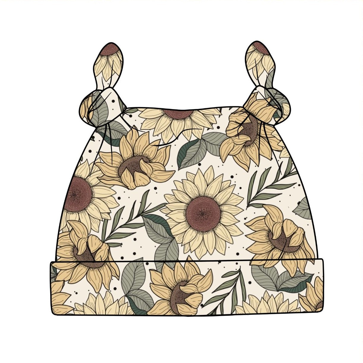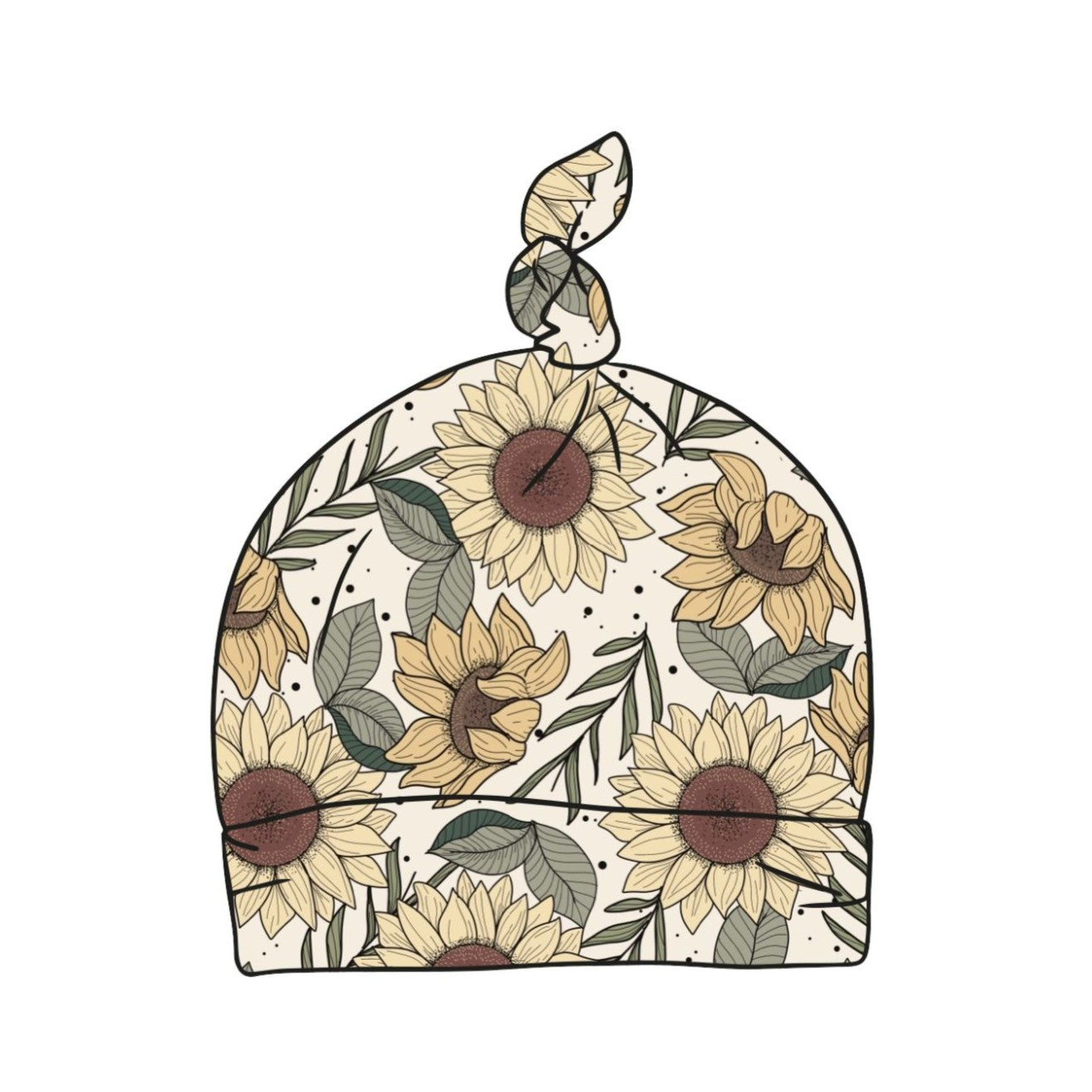 Keep tiny heads cosy and cute with our Sunflower Meadow print Baby Knotted Hat. Made from soft, breathable organic cotton, it features a beautiful floral print featuring sun-soaked sunflowers, rustic terracotta details, and soft green foliage, bringing a cheerful, nature-inspired touch to any little wardrobe.