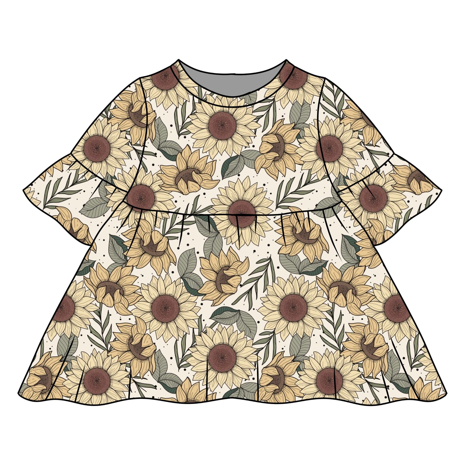 Pretty, practical, and perfect for little ones, our Sunflower Meadow print Baby and Children's Frill Sleeve Dress is designed for both everyday wear and special occasions.