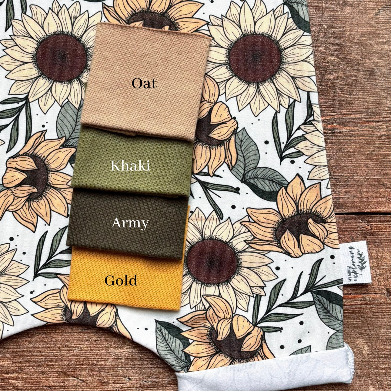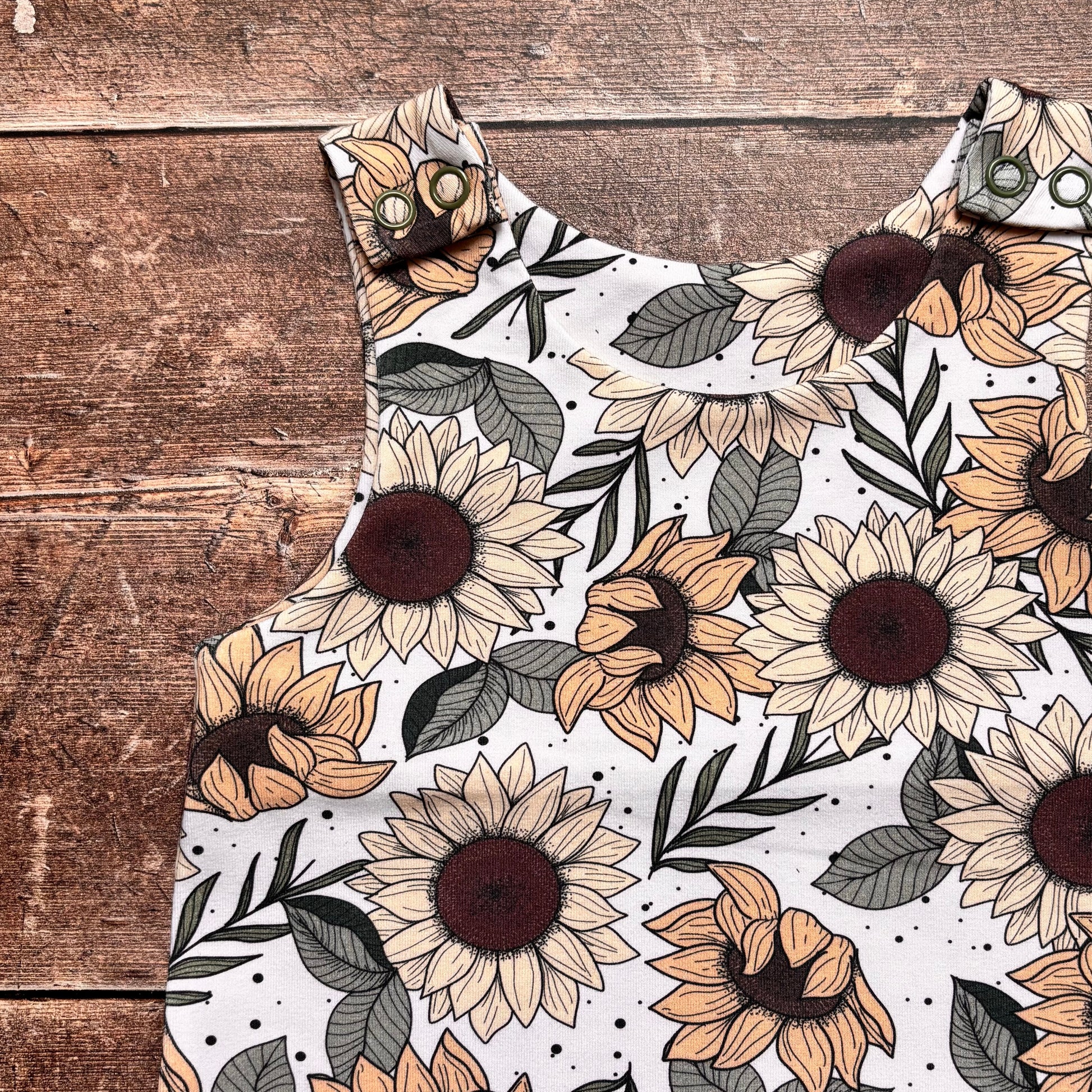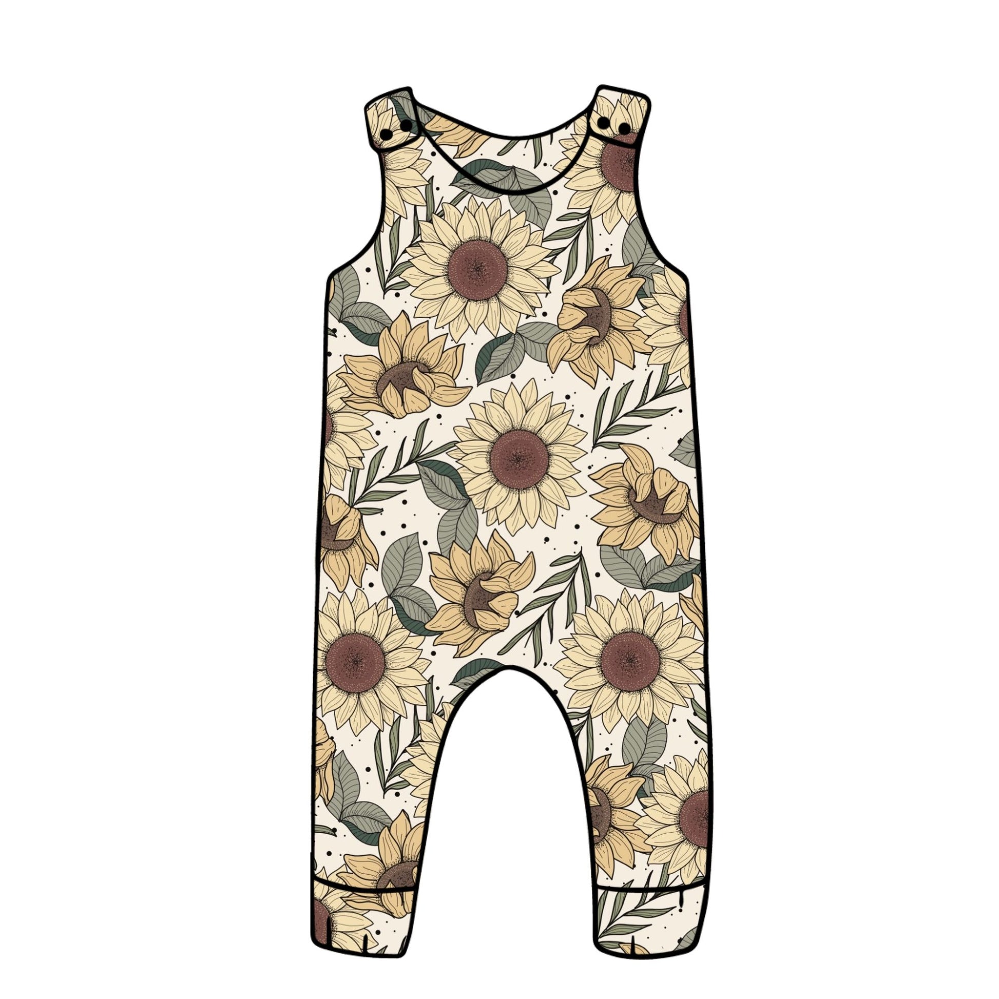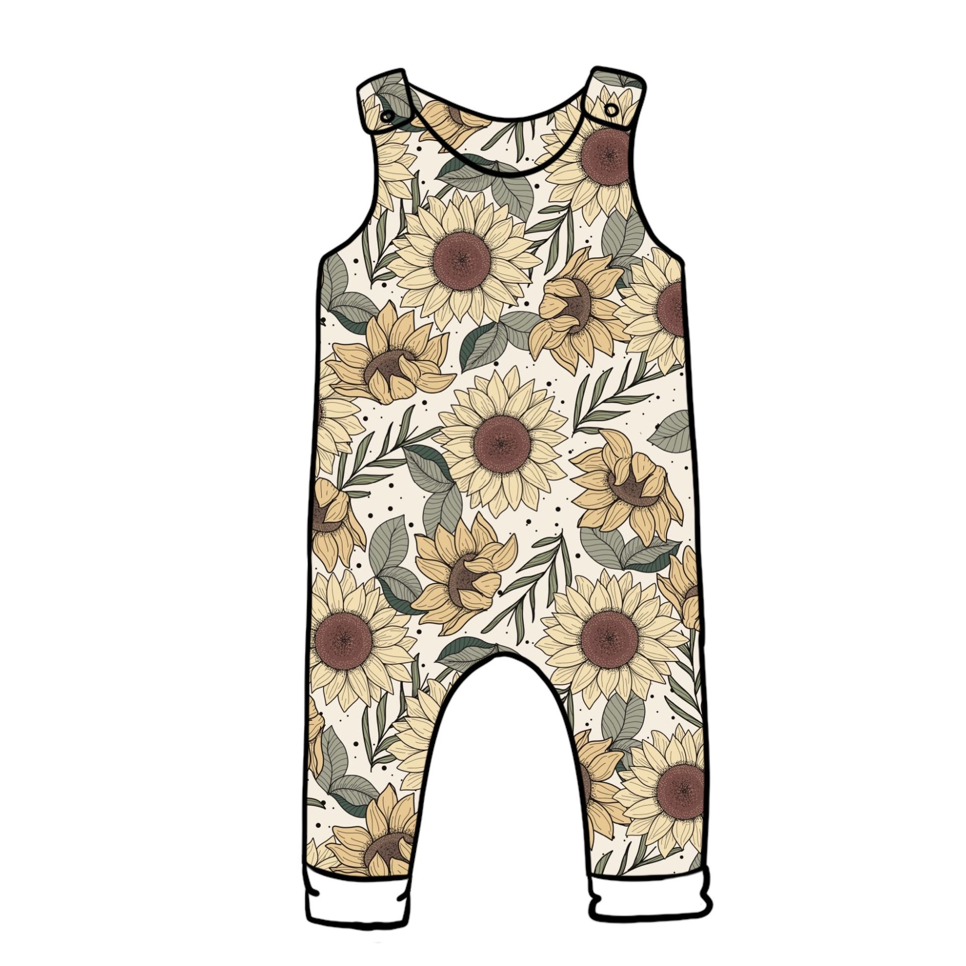 Ready for playtime, naptime, and everything in between, our Sunflower Meadow print Baby & Children's Full Length Romper is designed for all-day comfort and style. featuring a whimsical design of hand-drawn sunflowers, warm terracotta centres, and soft sage green leaves in gentle, nature-inspired tones, this romper is perfect for outdoor adventures, playdates, or cosy days at home.