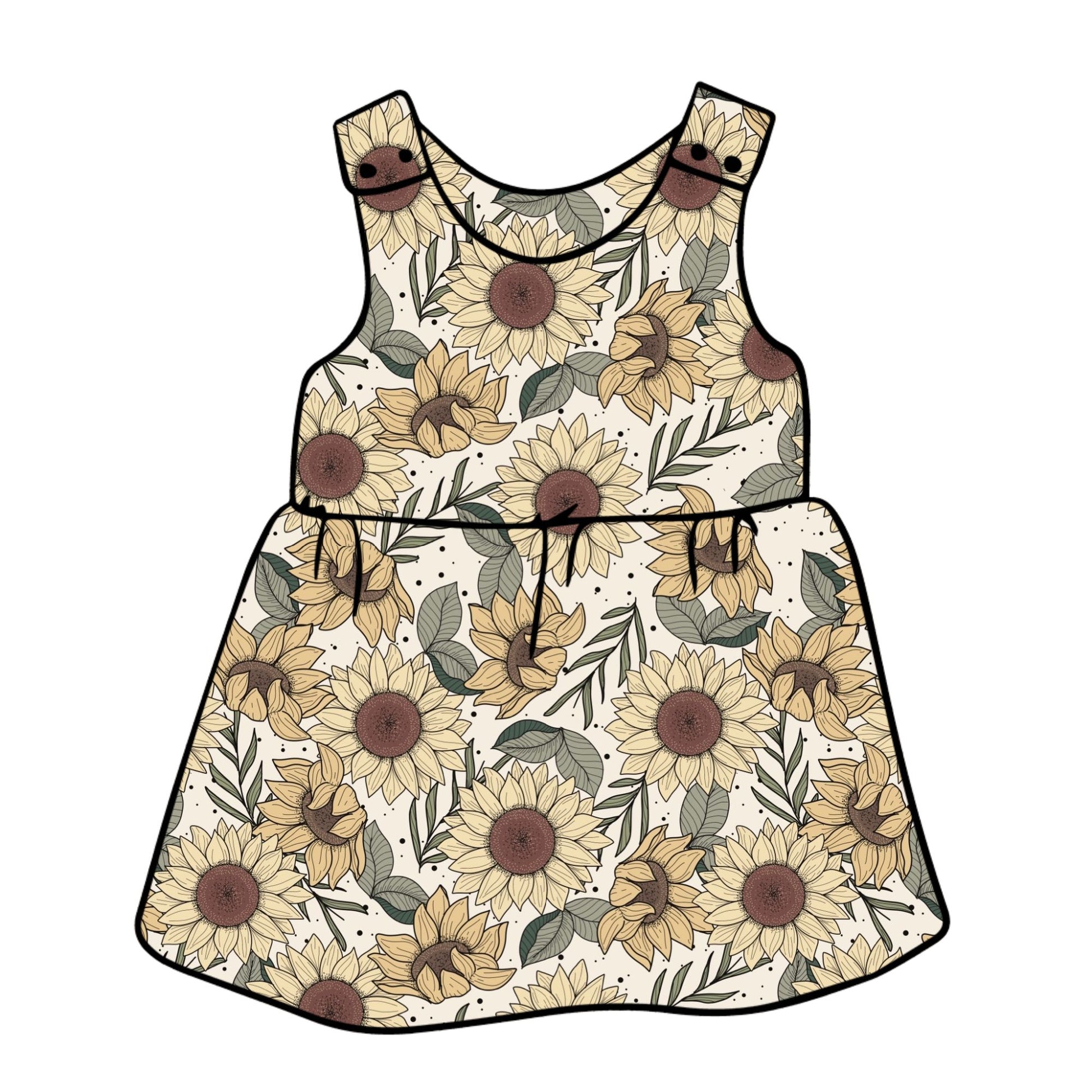 Bring a touch of gentle nature-inspired charm to your little one’s wardrobe with our Sunflower Meadow print Baby and Children's Pinafore Dress. Made from soft, breathable organic cotton, this adorable dress features hand-drawn sunflowers, rich terracotta centres, and soft sage leaves, making it a beautiful addition to your child's wardrobe.