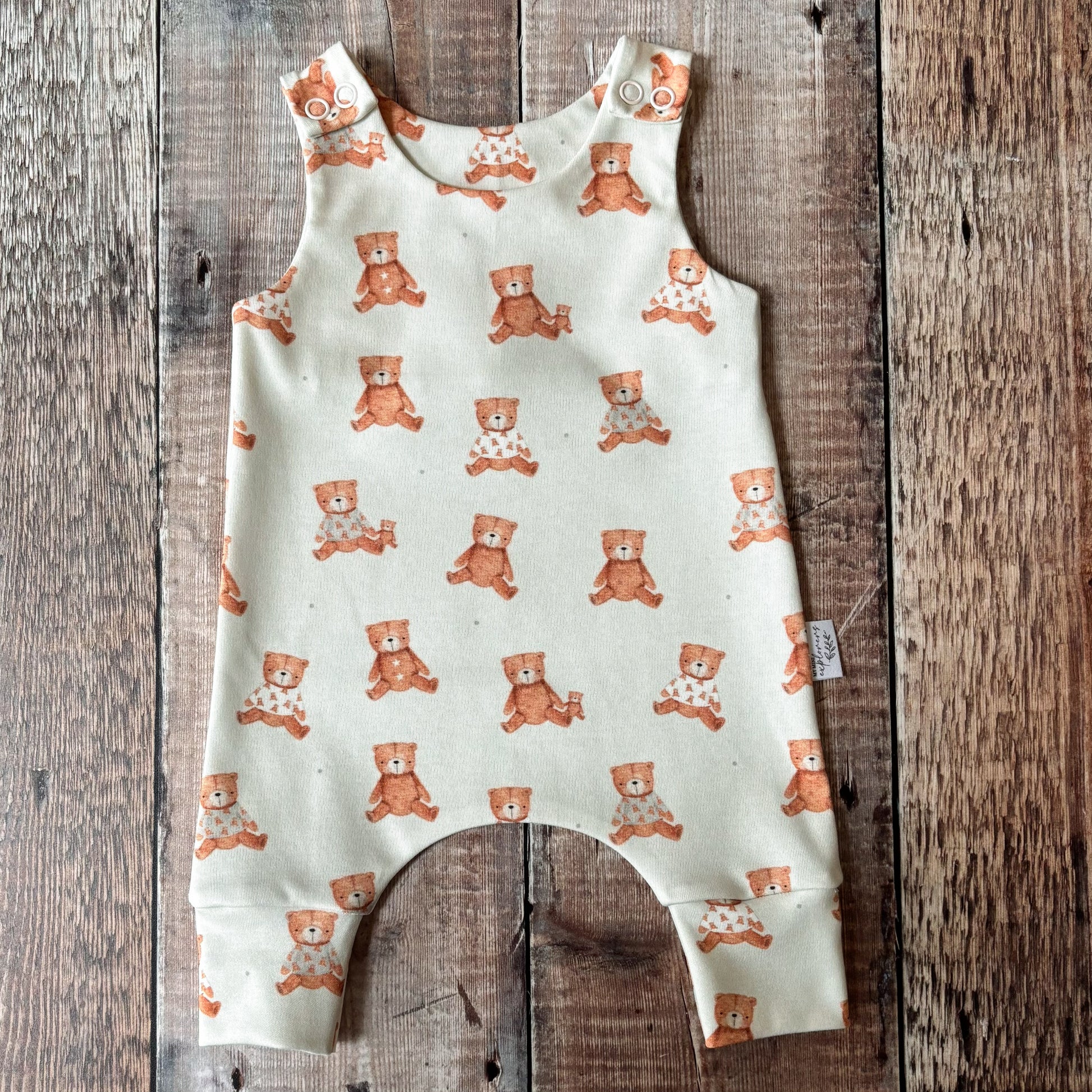 Beautifully handmade from organic cotton jersey knit. All rompers feature metal fasteners at each shoulder. Rompers are cut for both cloth and disposable nappies, giving your little one the freedom to wriggle, crawl or run about.
