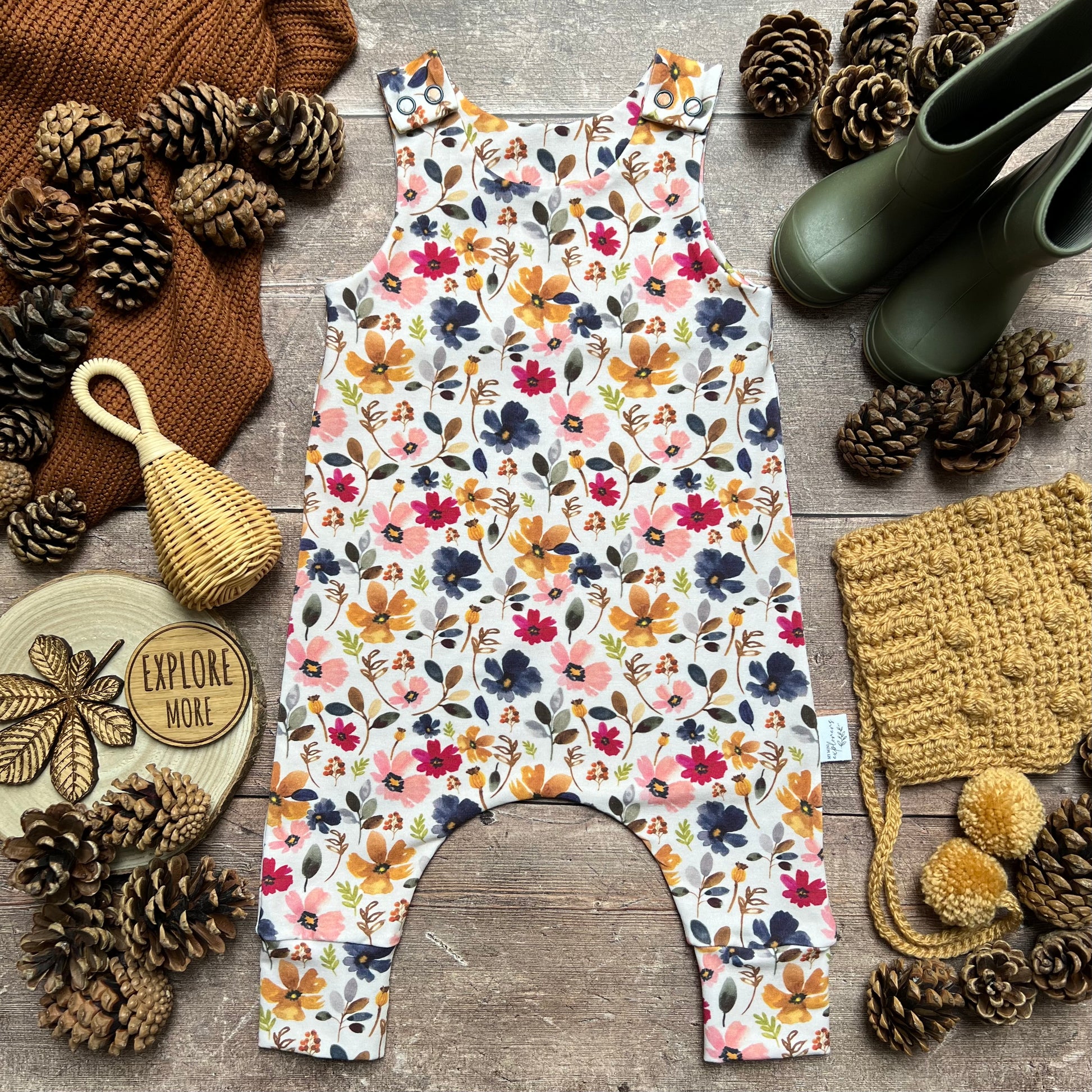 Handmade leggings, rompers, dresses and accessories - All items that I hand make are made from 95% organic cotton / 5% elastane, giving your mini explorers lots of room to explore and stretch. The only exceptions to this are our blankets which are 100% polyester making them super soft and cosy.