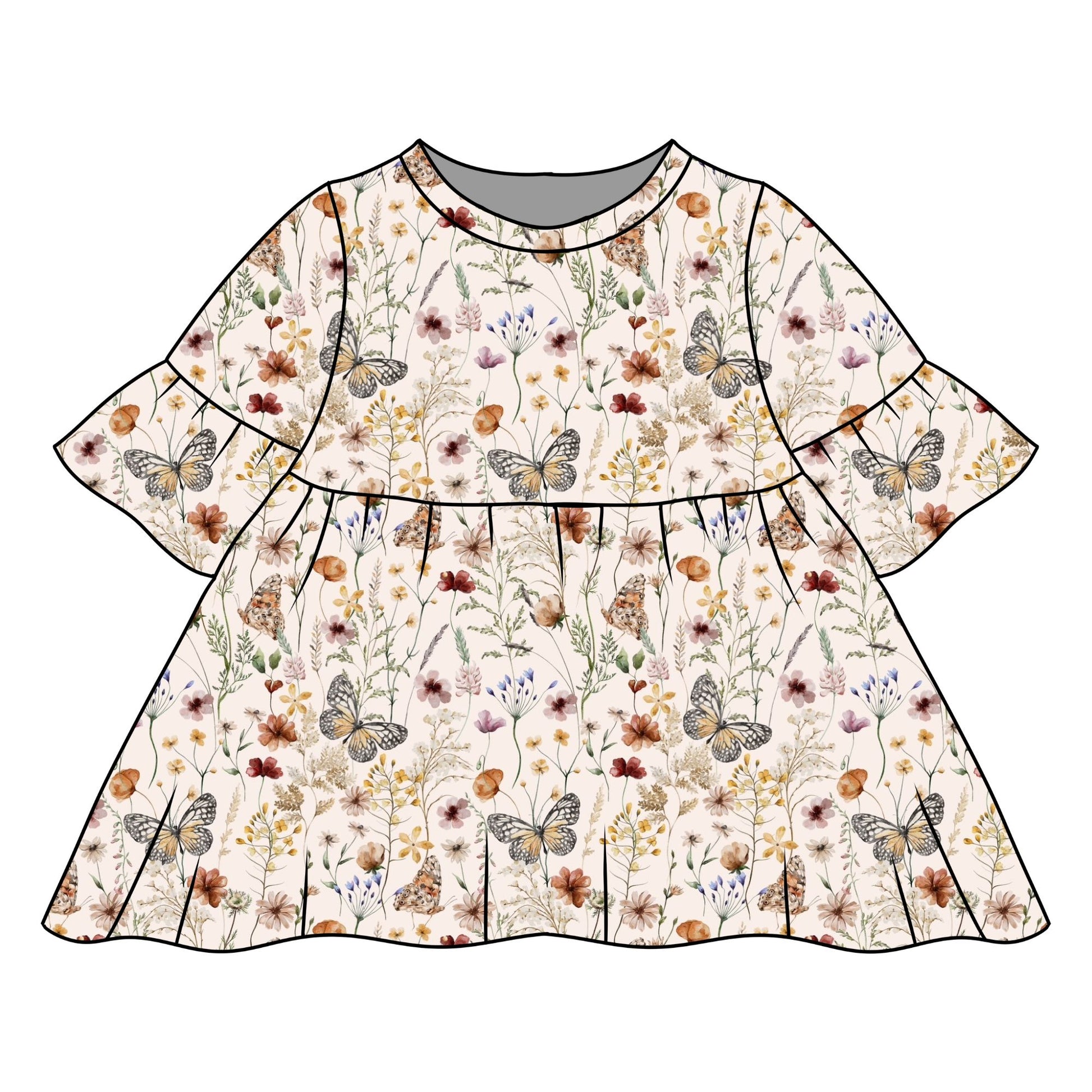 Made from soft, breathable organic cotton, this charming dress features a delicate wild meadow print with scattered wildflowers and fluttering butterflies in gentle, nature-inspired tones. With its 3/4 length frill sleeves and relaxed, comfortable fit, it’s an easy-to-wear outfit for babies and toddlers that blends whimsical, timeless style with cosy, effortless comfort.