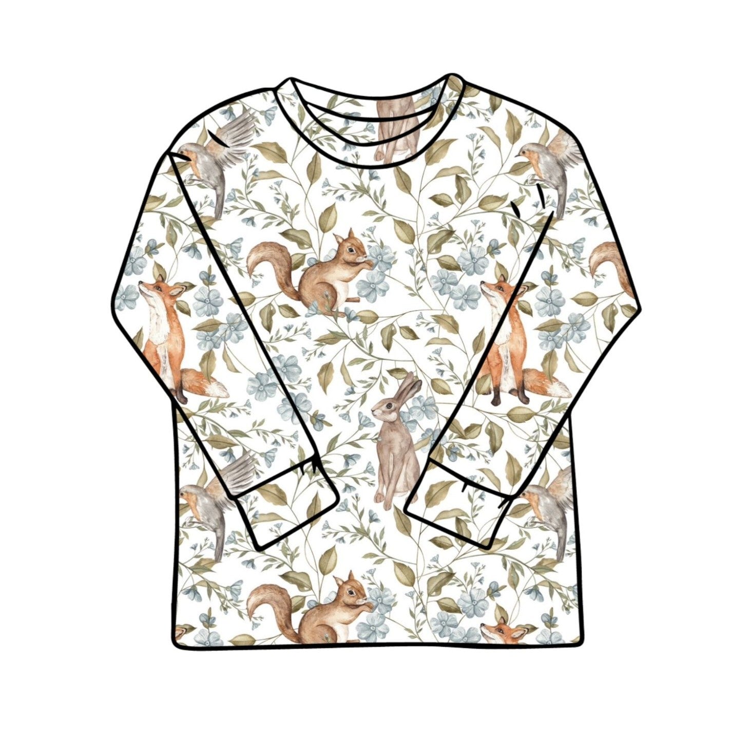 Pretty and practical, our Woodland Companions print Baby and Children's Long Sleeve T-Shirt is perfect for everyday wear or special occasions. Made from soft organic cotton, it features a whimsical meadow print with woodland animals, wildflowers, hares, foxes, squirrels, and robins in gentle, nature-inspired tones. With full length sleeves and a relaxed, comfortable fit, this comfy tee is perfect for playdates, park adventures, and everything in between. A versatile essential for little explorers.
