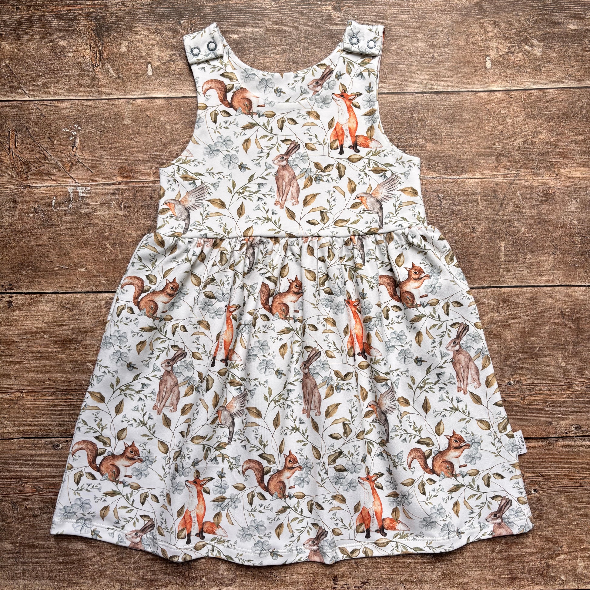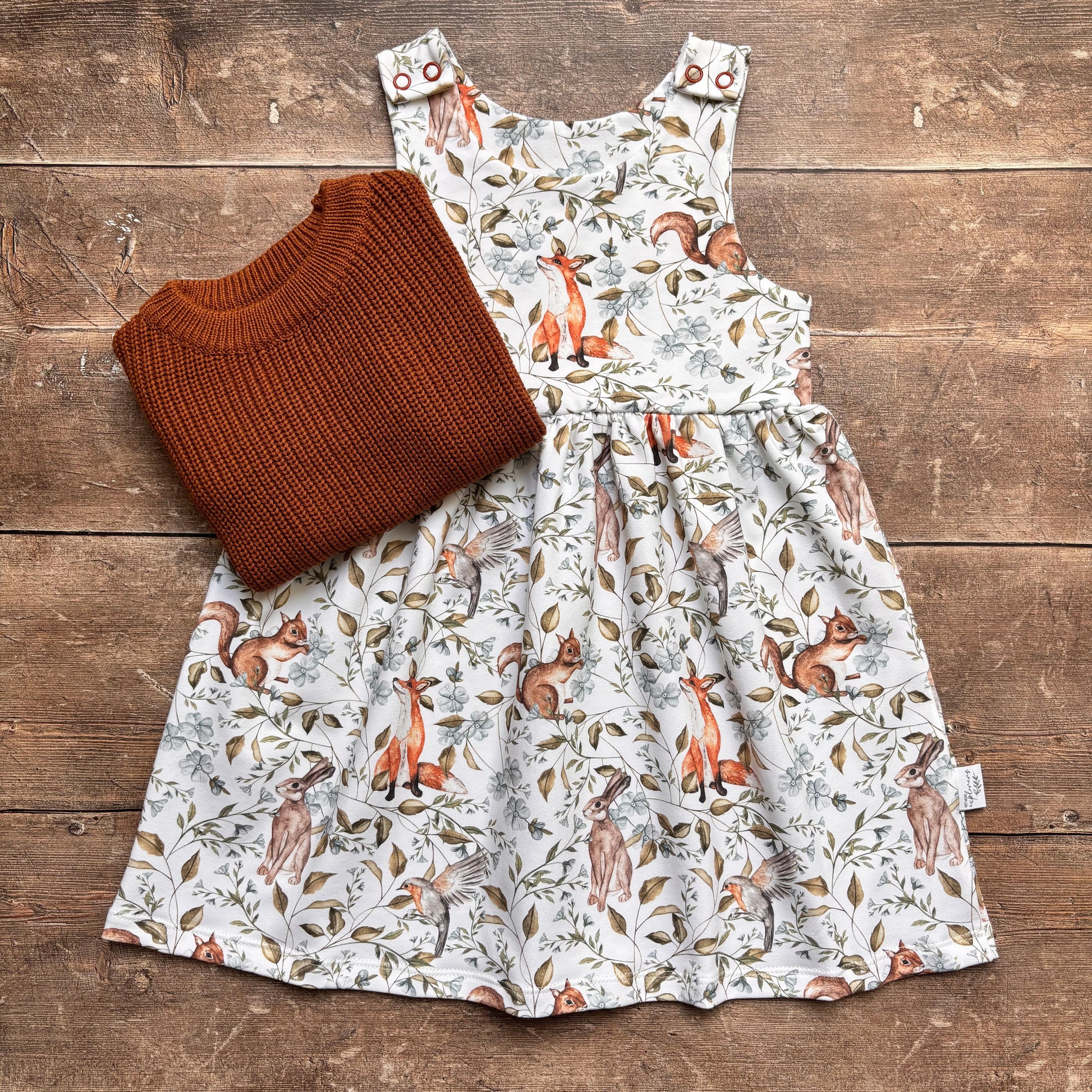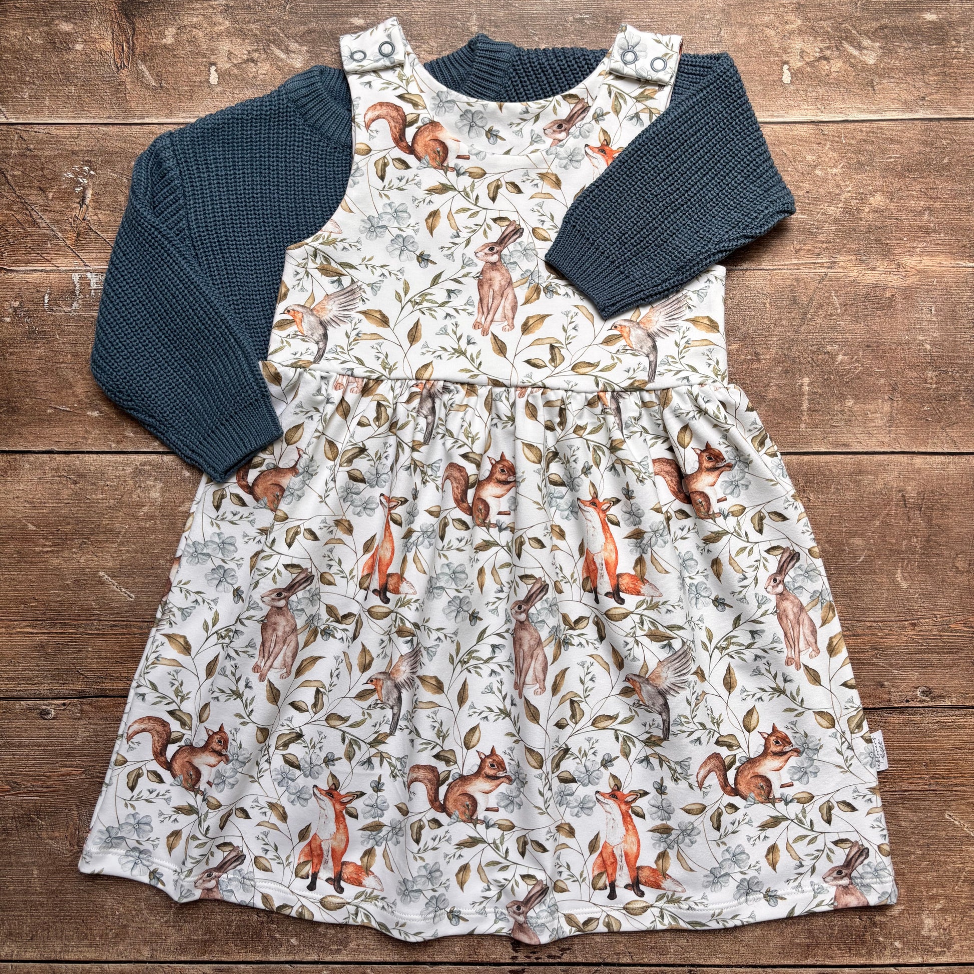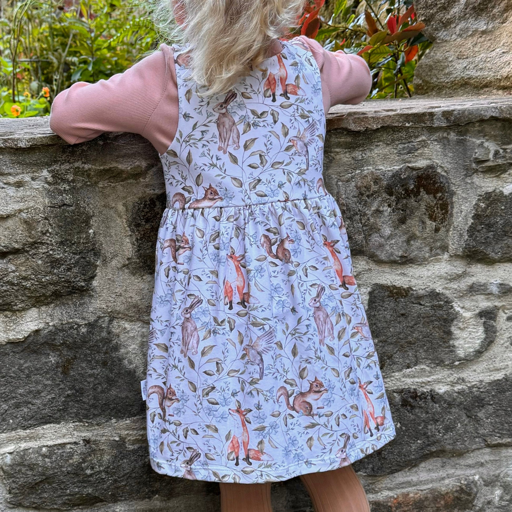 Bring a touch of countryside charm to your little one’s wardrobe with our Woodland Companions print Baby and Children's Pinafore Dress. Made from soft organic cotton, this adorable dress features a whimsical meadow print with woodland animals, wildflowers, hares, foxes, squirrels, and robins.