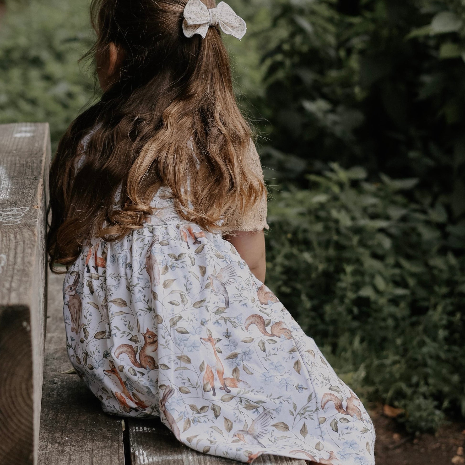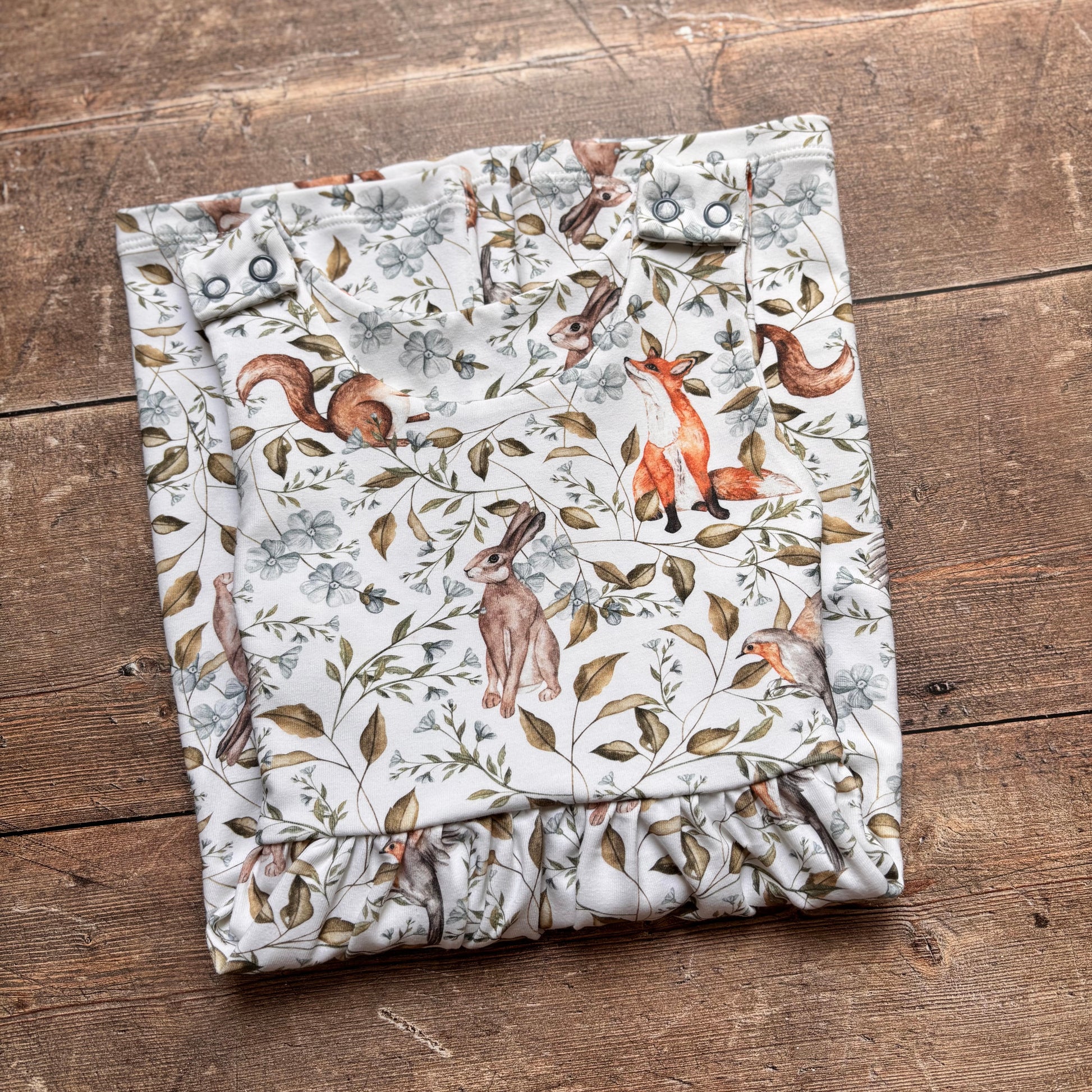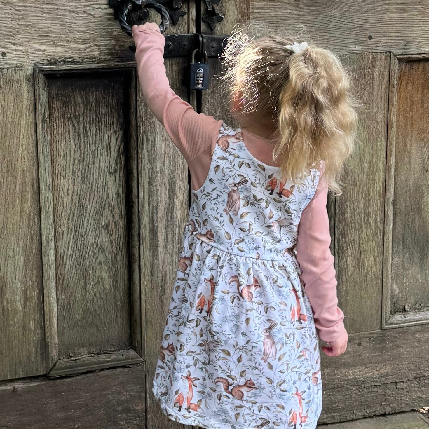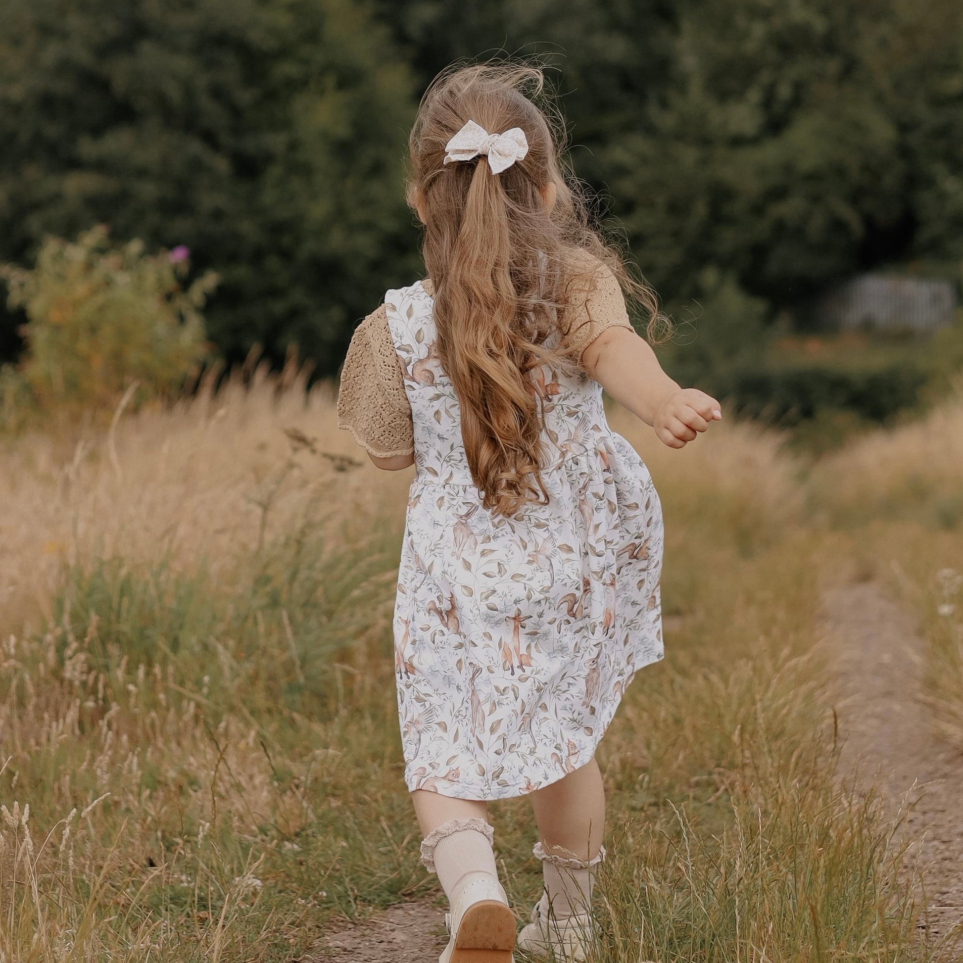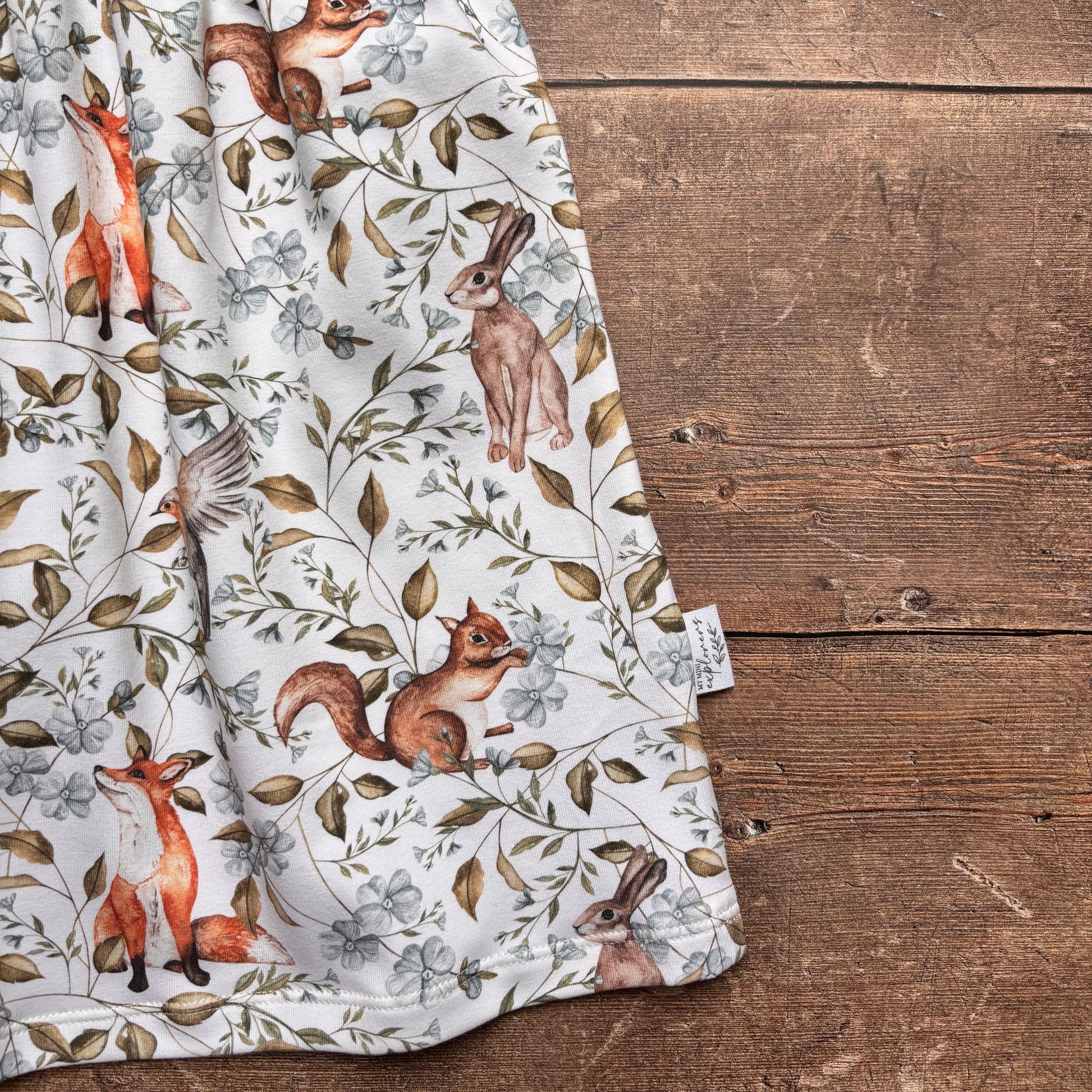 Bring a touch of countryside charm to your little one’s wardrobe with our Woodland Companions print Baby and Children's Pinafore Dress. Made from soft organic cotton, this adorable dress features a whimsical meadow print with woodland animals, wildflowers, hares, foxes, squirrels, and robins.