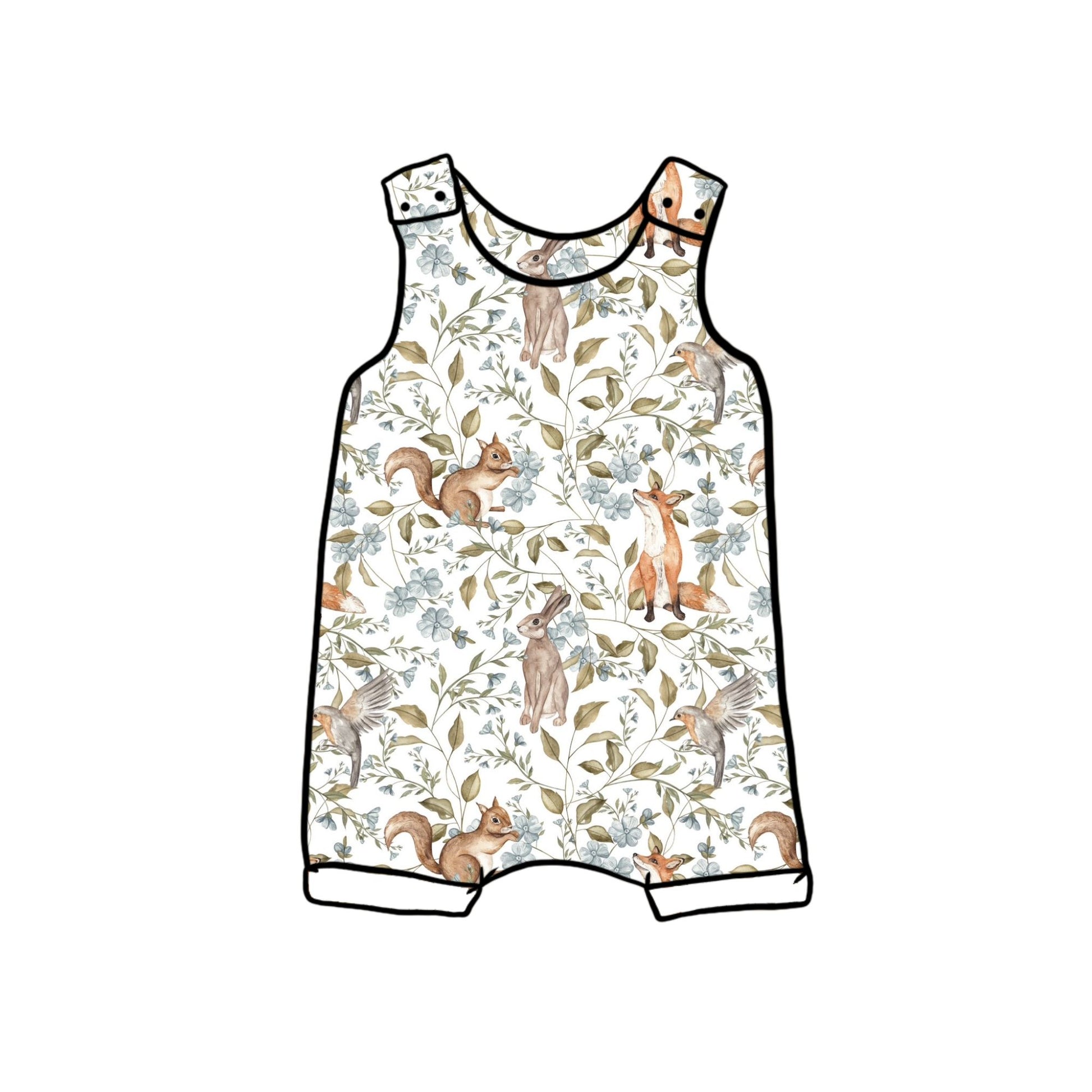 Let your little one play, explore, and relax in style with our Woodland Companions print Baby & Children's Short Romper. Featuring a whimsical meadow print with woodland animals, wildflowers, hares, foxes, squirrels, and robins in gentle, nature-inspired tones, its the perfect print for countryside family days out.