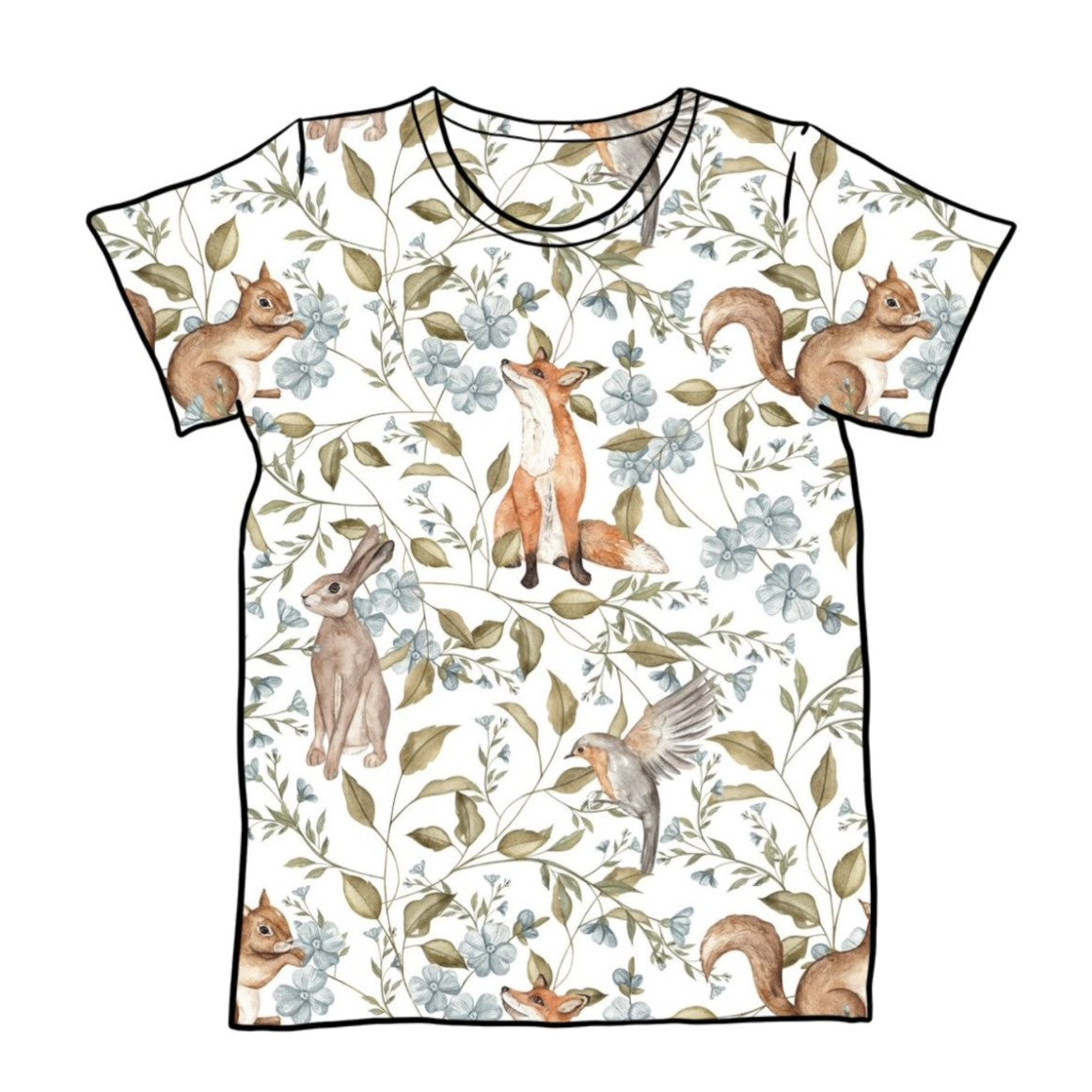 Pretty and practical, our Woodland Companions print Short Sleeve Baby and Children's T-Shirt is perfect for everyday wear or special occasions. Made from soft organic cotton, it features a whimsical meadow print with woodland animals, wildflowers, hares, foxes, squirrels, and robins in gentle, nature-inspired tones. With short sleeves and a relaxed, comfortable fit, this comfy tee is perfect for playdates, park adventures, and everything in between. A versatile essential for little explorers.